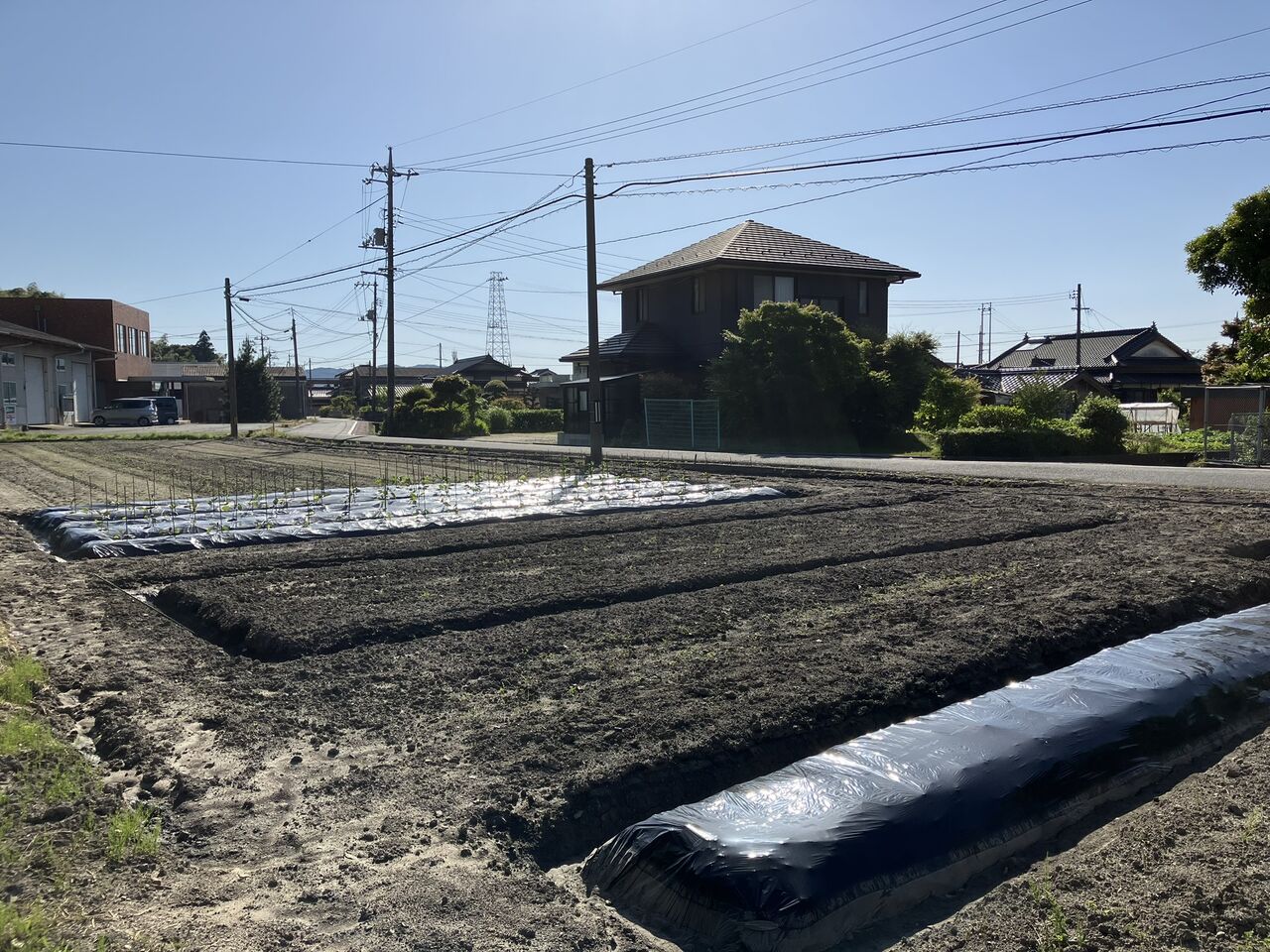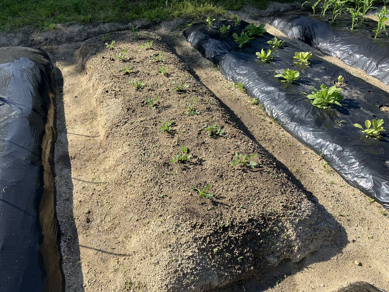 翌日マルチを掛けました。芽が出てきたらマルチに穴を開けます。