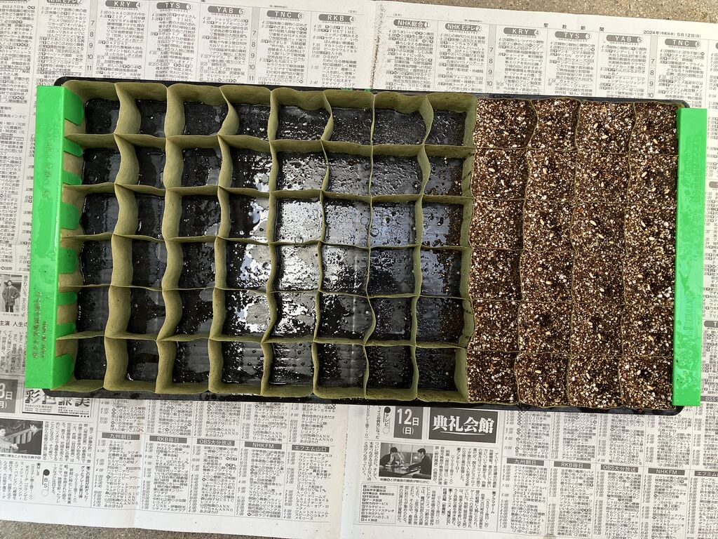 種は72セルのペーパーポットの24セルだけ使って2粒ずつ蒔きました。