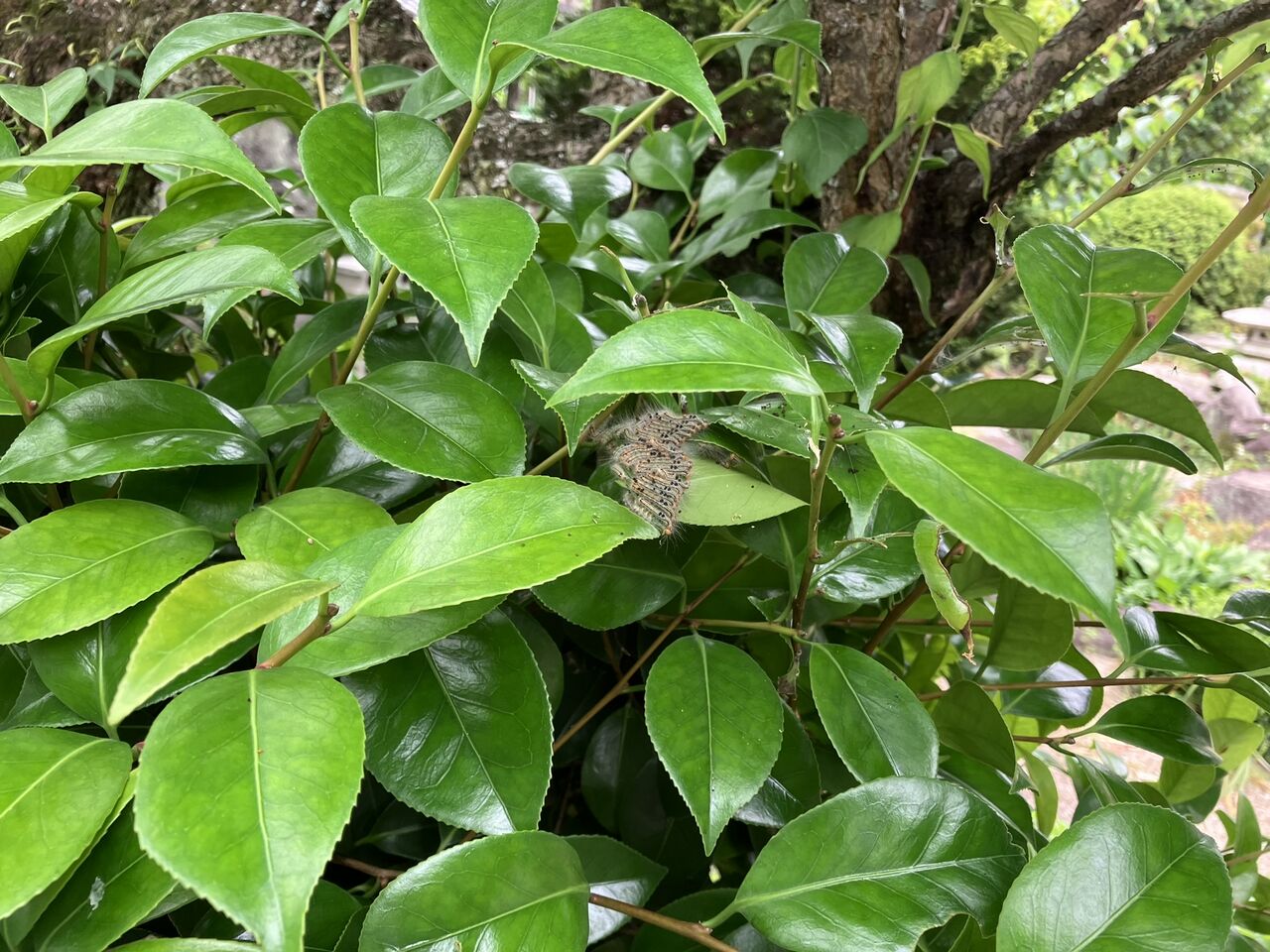 梅の実を収穫していたら、庭中央の梅の木の下にある椿にチャドクガが発生しているのに気付きました。