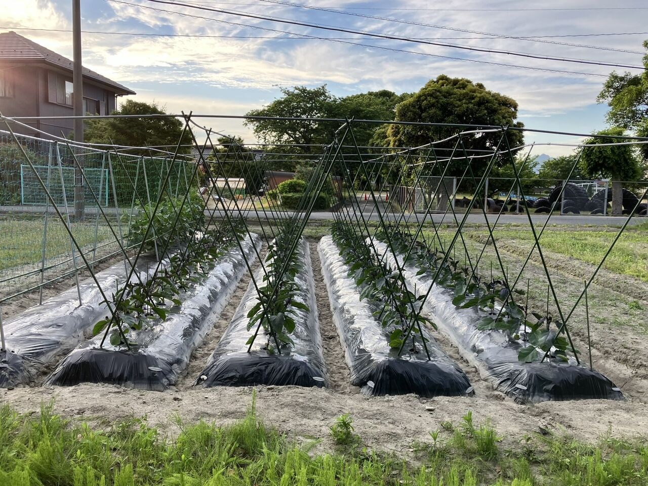 ナスはV字支柱を立てて枝を4本に整えて(4本仕立て)育てます。