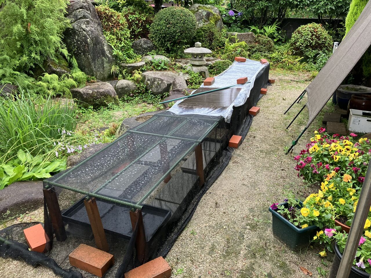 花の苗が堀上げ苗で根が剥き出しで、たくさん雨が降ると土が流れてしまうので、苗置き場にビニールシートをかけました。
