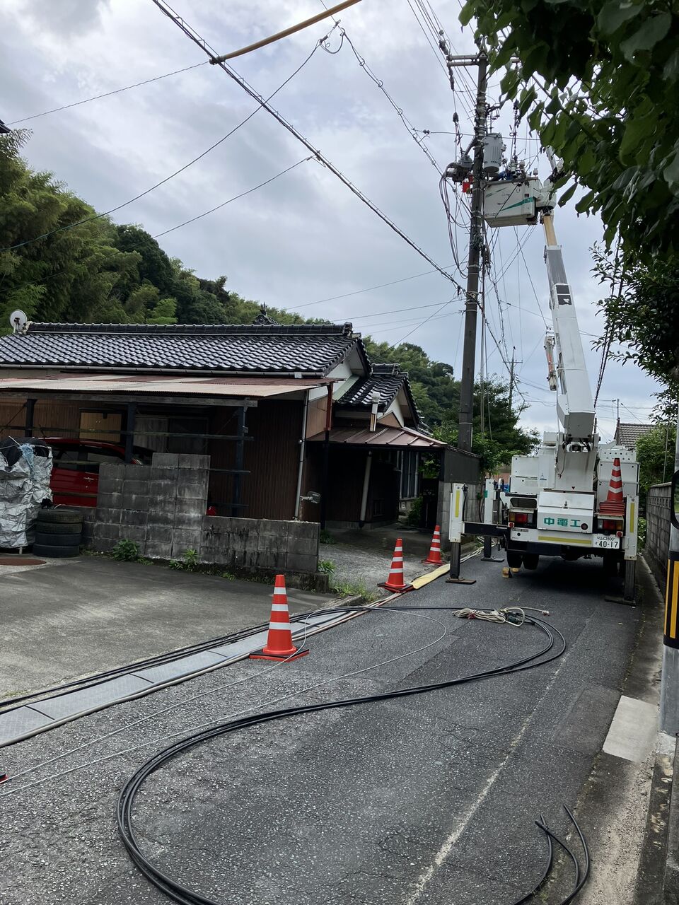 昨日(7月23日)は家の前の道路を通行止めにして、立て替える電柱の両側の電柱にバイパスケーブル切り替え用の遮断機をつける工事をしていました。我が家の引き込み線は立て替え電柱の西側の電柱からなので、バイパスケーブルの内側になります。