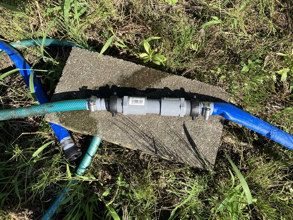 途中、小川から100mの所で西側畑の水やり用の20mmホースをつなげるようにホースカップリングでつなぎ変えれるようにしています。