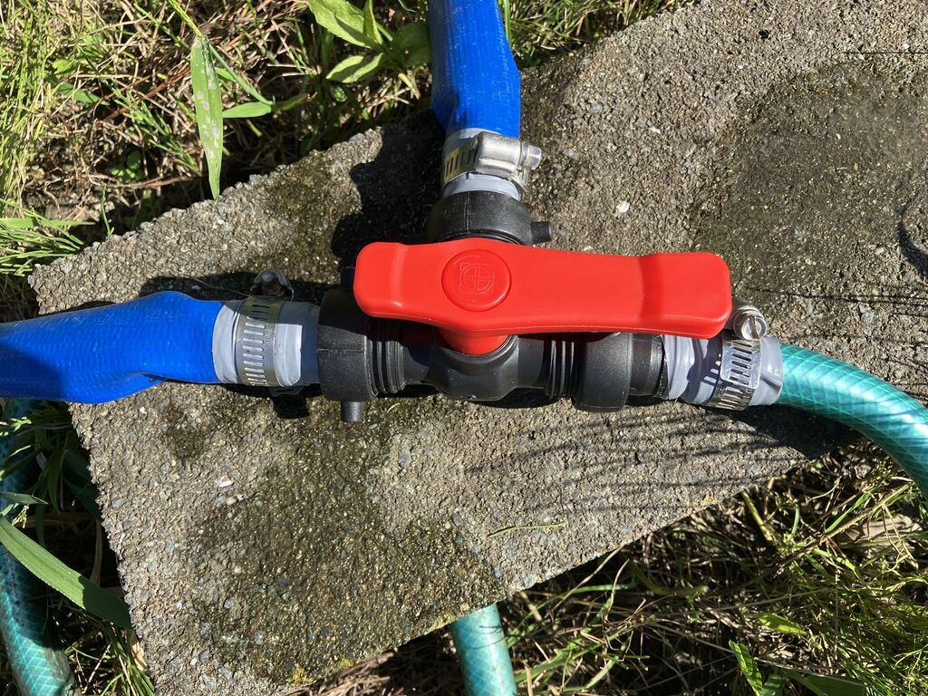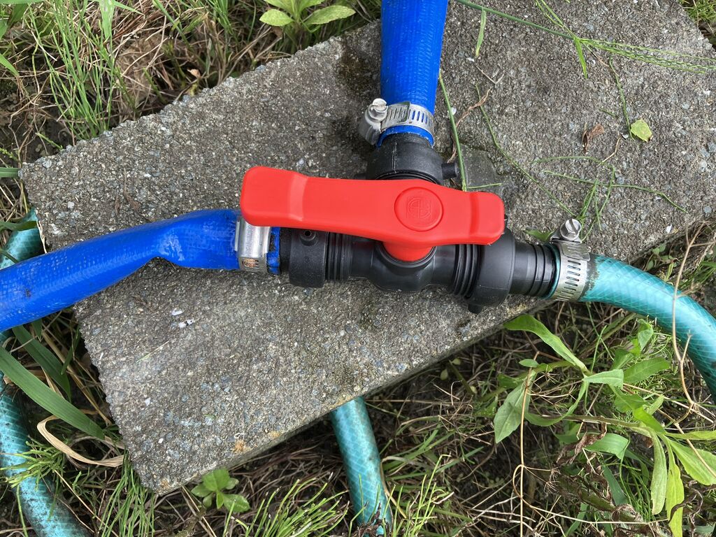 思っていたより手間がかかりましたが、これで東側貯水タンクと西側ホースの切替を、ホースをつなぎ直さずにバルブ操作で行えます。