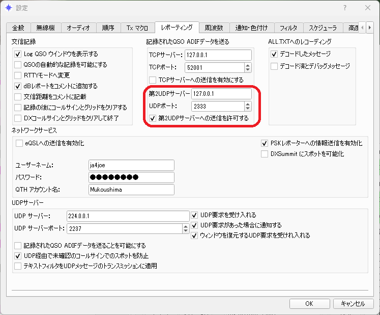 「記録されたQSO ADIFデータを送る」の第2UDPサーバーを有効にします。