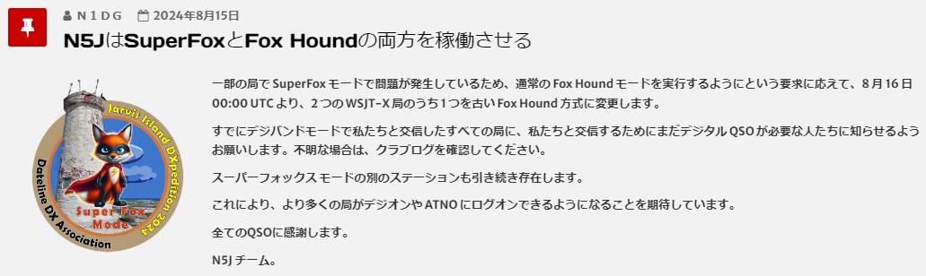 ブログ読者の方から教えていただきましたが(TNX JR5JEU)、N5J ジャーヴィス島 DXペディションが従来の F/H(Fox Hound) モードでもサービスをしてくれているようです。