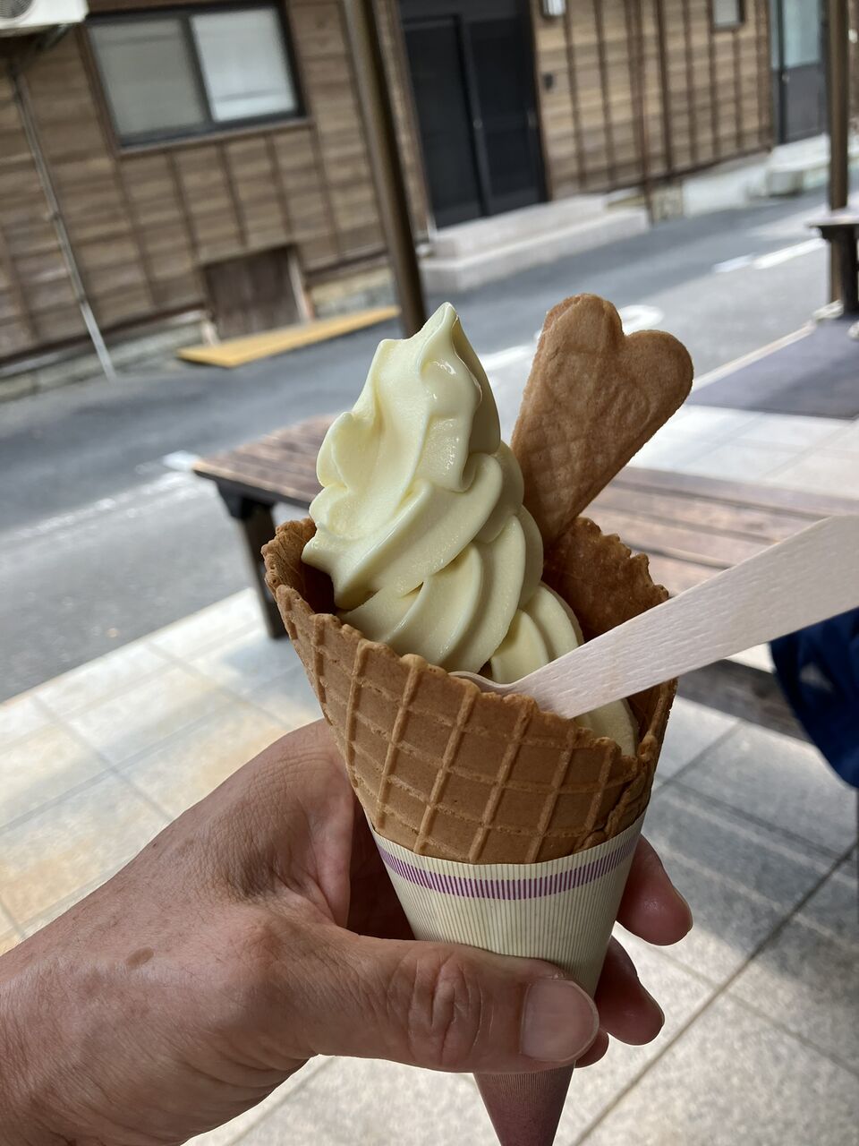 ソフトクリーム屋さんは「日本一 ソフトクリーム むさし」と「佐々木屋小次郎商店」が店を並べて戦っていますが、扇風機を置いた席のある小次郎にしました。(笑)