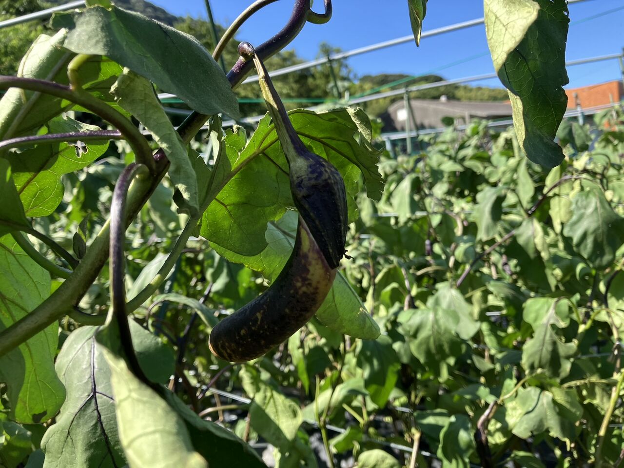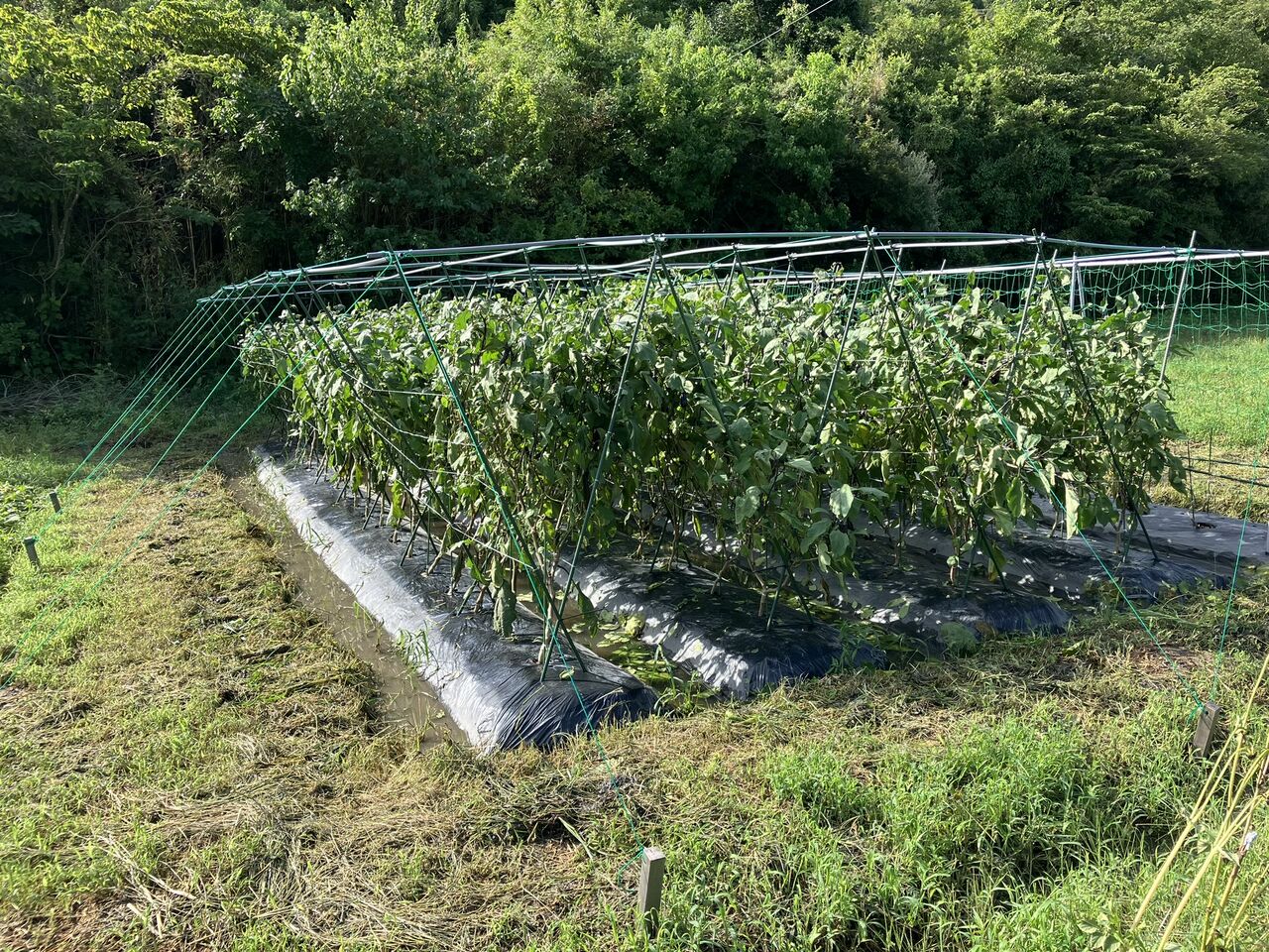 ただ、ナス畝の東外側列の枝の誘引テープが外れて枝が内側に倒れていました。