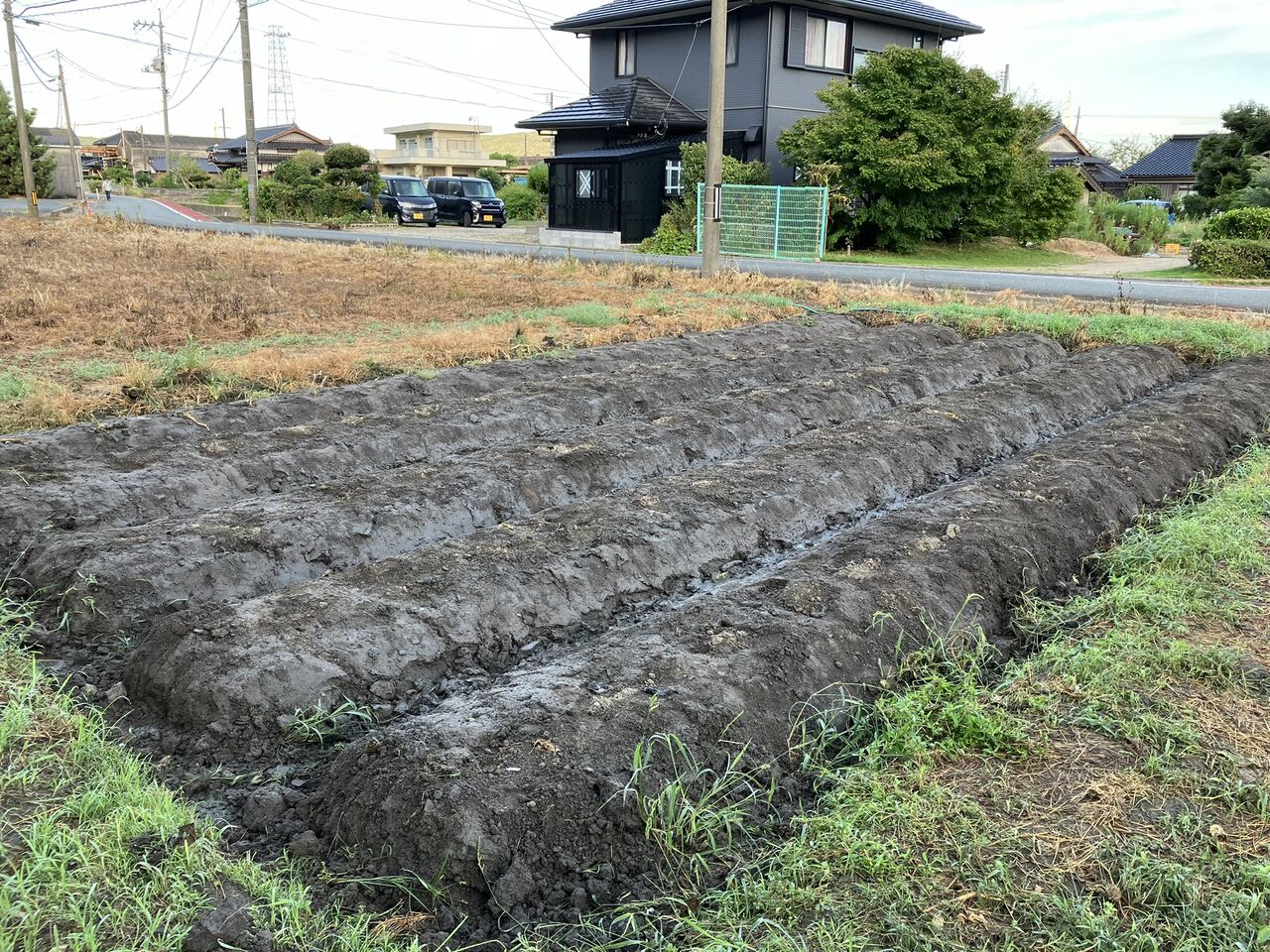 重い耕運機を使った後に鍬で溝を掘るのはきつかったです。暑いし。(^^;