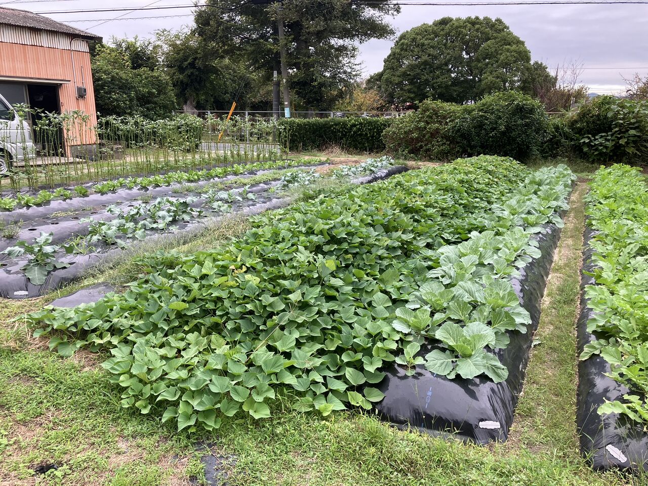 収穫前のサツマイモ畝です。まだ葉が茂っていました。