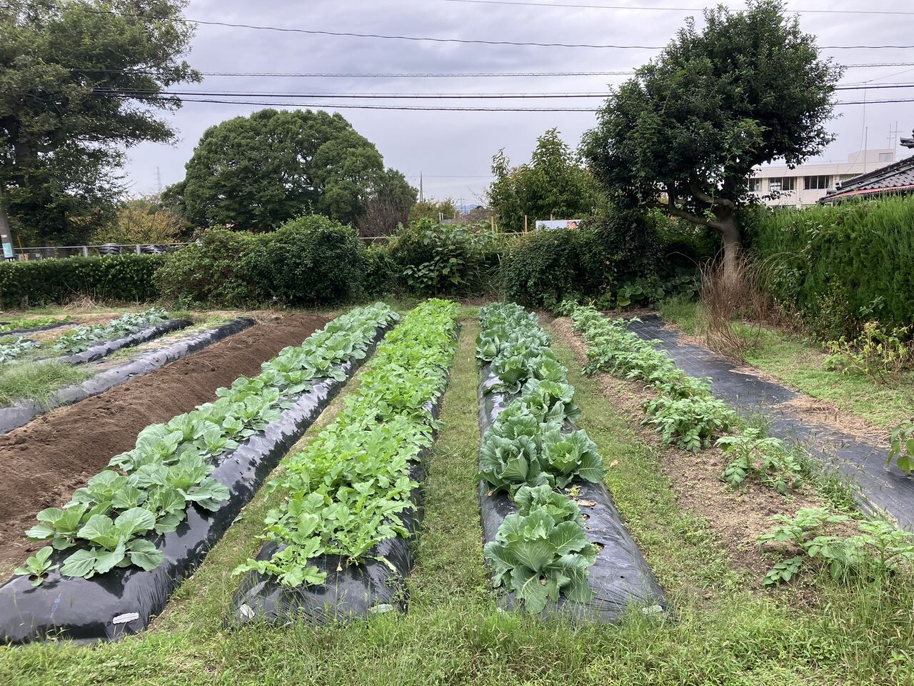 奥の畝です。左から、冬キャベツ、ダイコン、秋キャベツ、ジャガイモです。