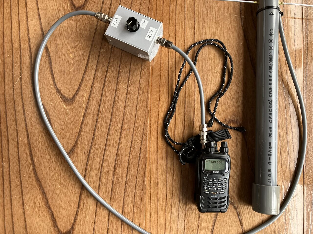 Sメーター振り切れ対策用のアッテネーターとDJ-G7を接続して使います。DJ-G7は首から下げて使うのでストラップを付けました。