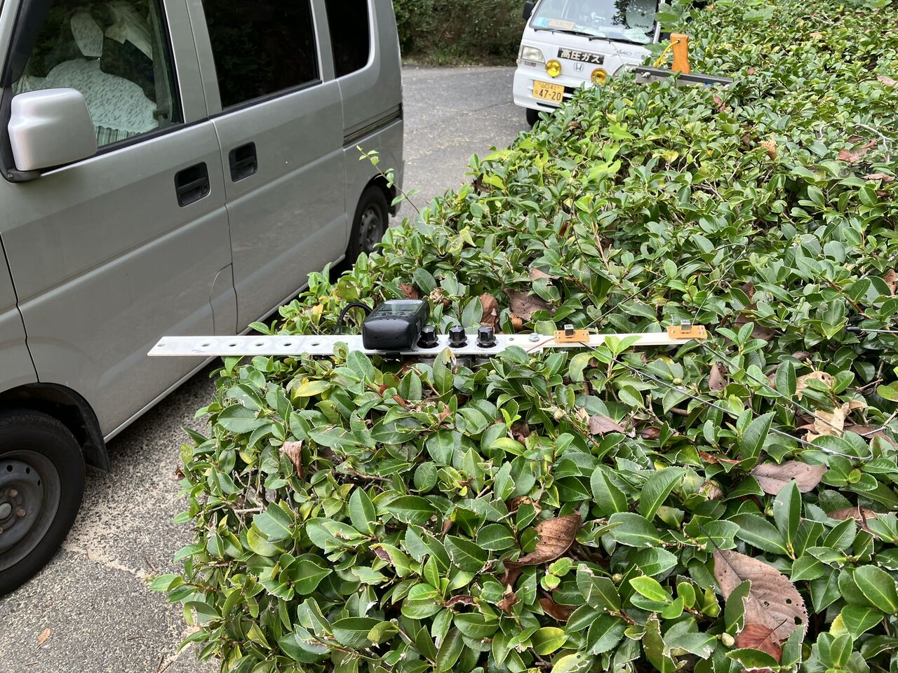 軽トラの荷台にジュラルミンかばんの送信機とアンテナが置いてありました。