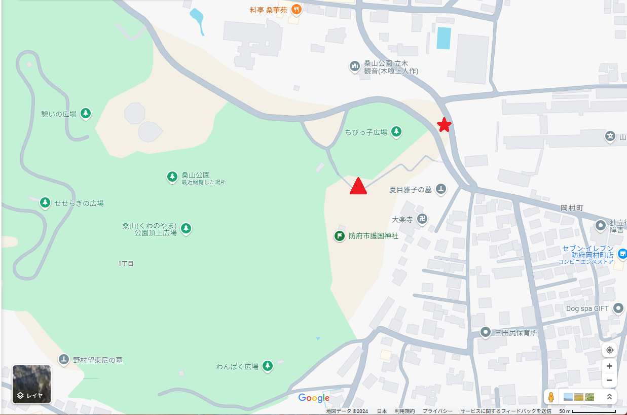 場所は地図の☆の位置です。地図上ではとても近いですが、高低差があり樹木で遮られているので分かりにくい場所です。