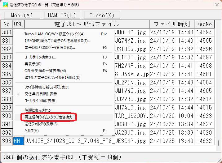 [送信済みQSL] 一覧のメニューから「電子QSLを再送」した場合、ファイル時刻は更新されませんが、再送時にファイル時刻を更新する設定が追加されました。