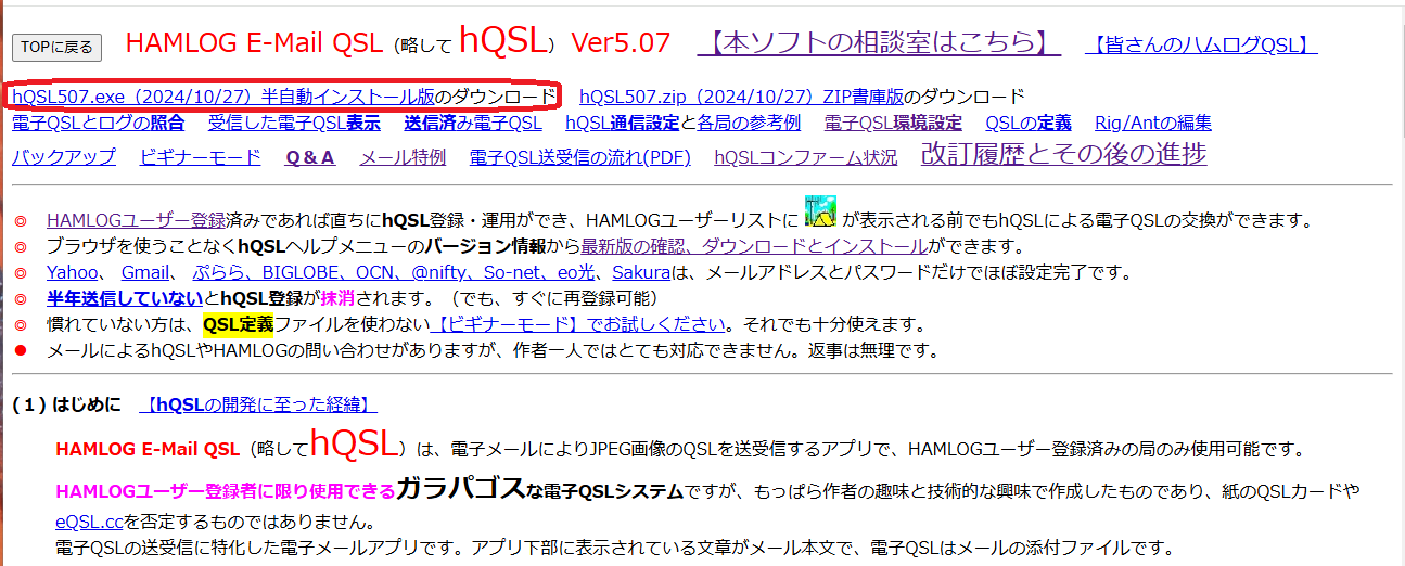hQSLのホームページから hQSL507.exe(2024/10/27)半自動インストール版 をダウンロードして上書きインストールします。