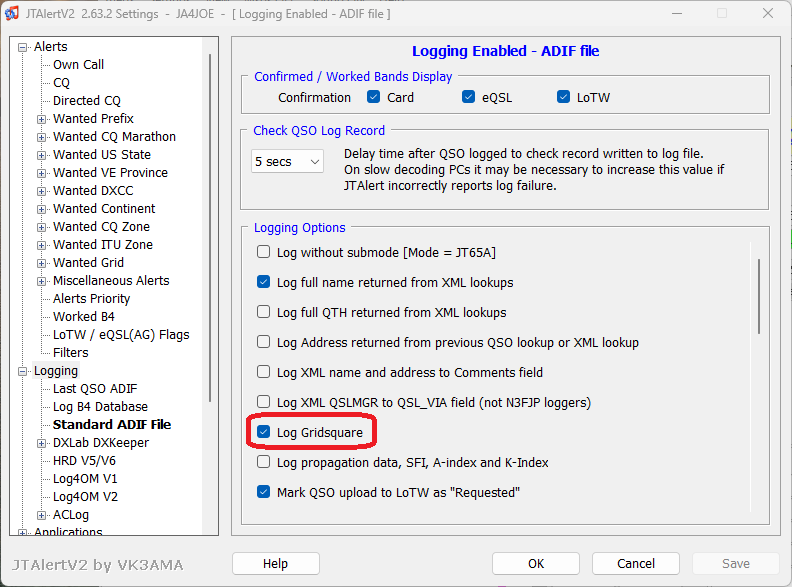 - Logging Options 「Log Gridsquare」これはデフォルトで有効になっています。チェックを外すと、グリッドがログに記録されなくなります。グリッドのログを記録したくない場合は、ユーザーが一度だけ意図的に設定を変更する必要があります。これは、すべてのグリッドデータソース、xml、前回のログ入力、オンエアデコードグリッド、Wsjtxグリッドフィールド、およびJTAlert手動入力グリッドに影響することに注意してください。