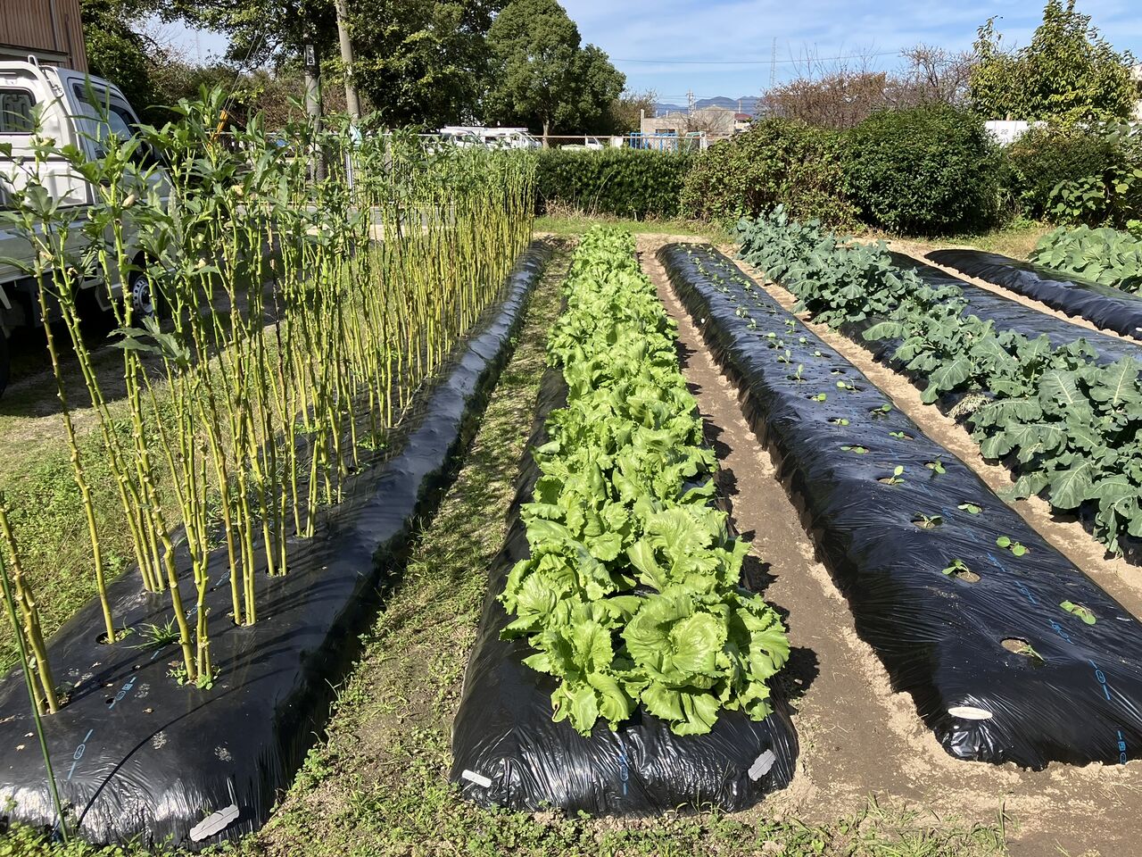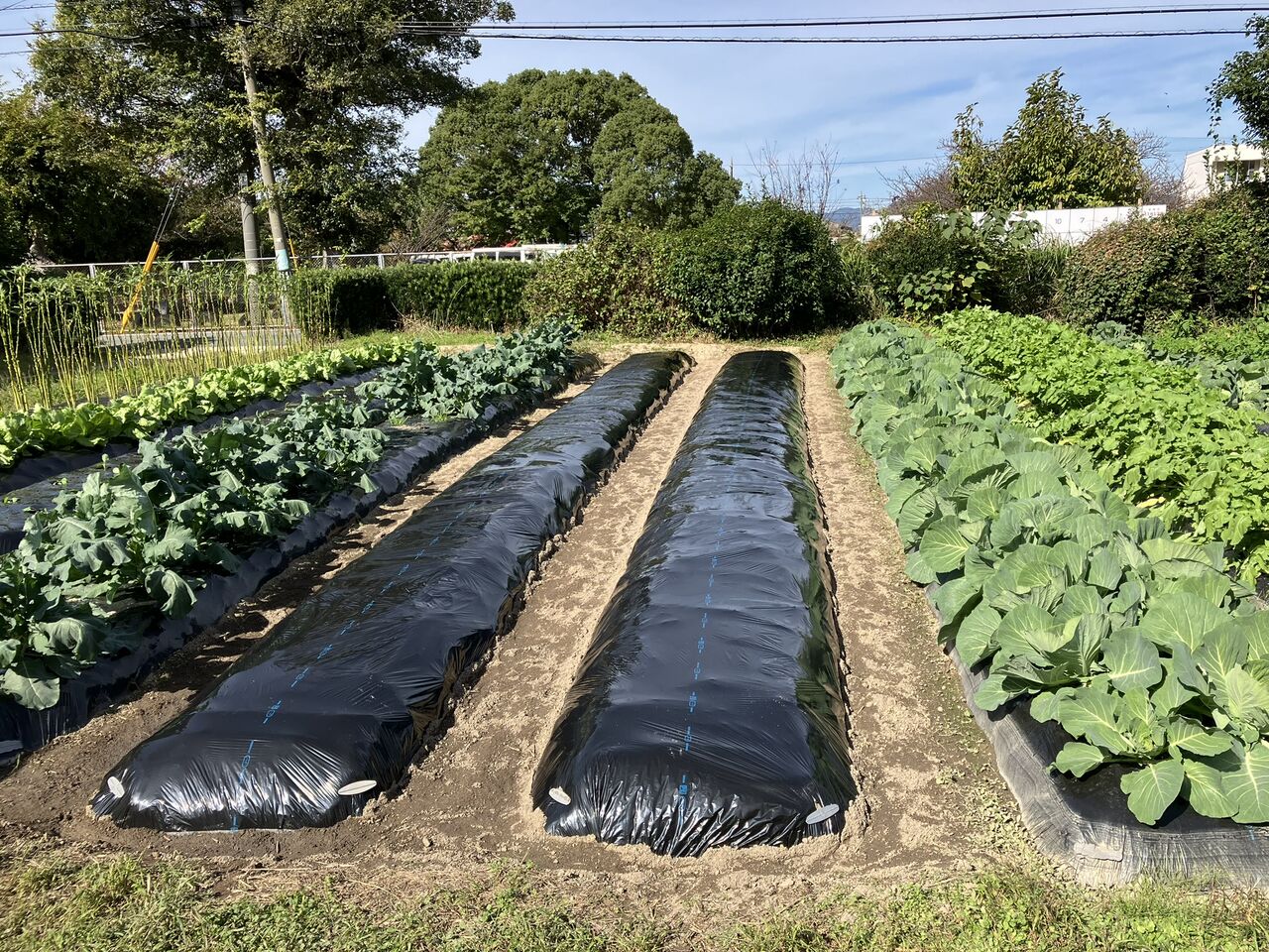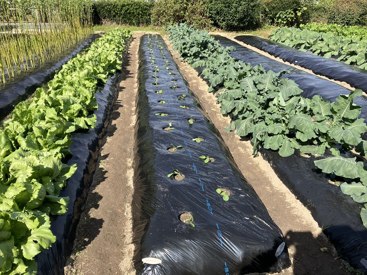 ブロッコリーと冬キャベツの間の2畝を耕してマルチをかけました。ここは、初夏採りキャベツとソラマメを植える予定です。