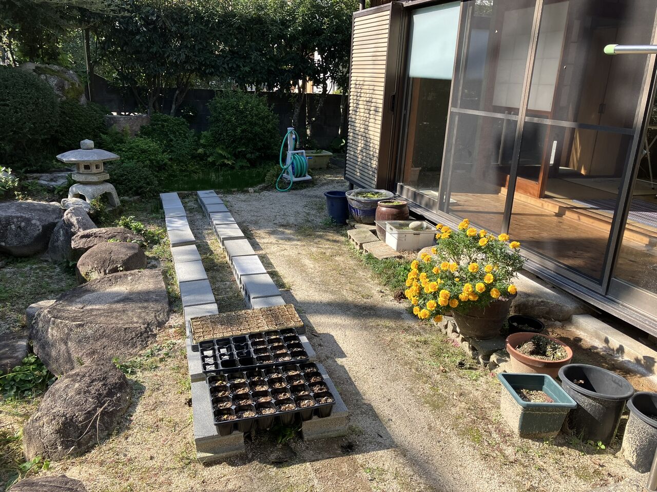 育苗用の寒冷紗を撤去しましたが、苗置きのブロックは自治会花壇のパンジー苗の一時置き場として残してあります。縁側の日除けと西側のゴーヤネットも撤去しました。