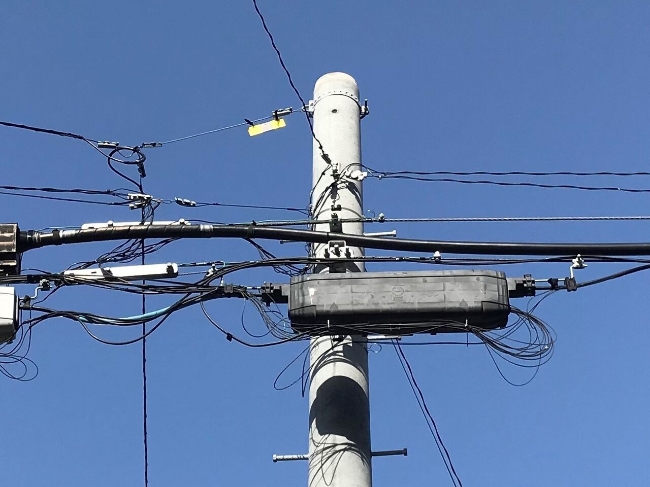 我が家の前の電話柱のNTTの光クロージャ―です。