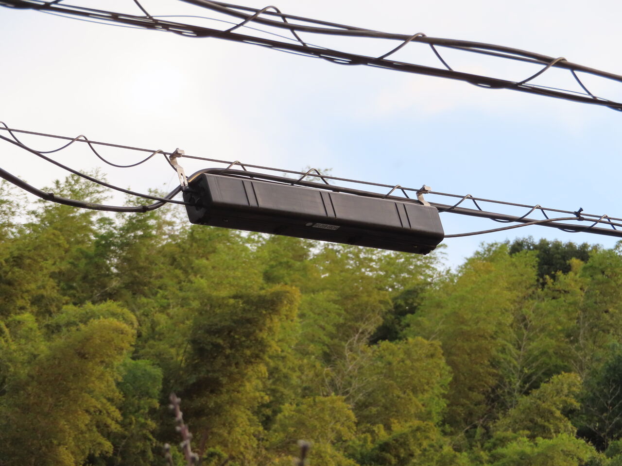 電柱に架線してあるCATV同軸ケーブルに沿わせてパケット車を移動しながら、光ケーブルを入れて行くので工事は数時間で終わりました。