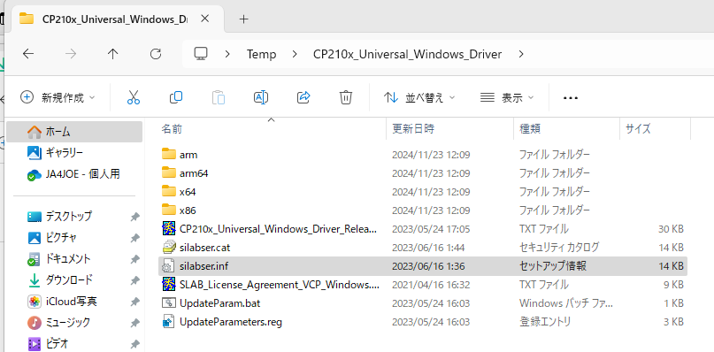 シリコンラボのダウンロードページのCP210x ユニバーサル Windows ドライバー CP210x_Universal_Windows_Driver.zip をダウンロードして、silabser.inf をインストールします。(
