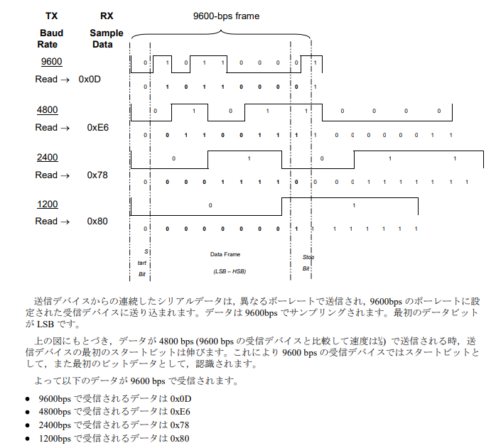 9600bpsで受信待受けすると、9600/4800/2400/1200bpsの場合にそれぞれ、0x0D、0xE6、0x78、0x80を受信するので、UARTの速度設定を変更するというものです。