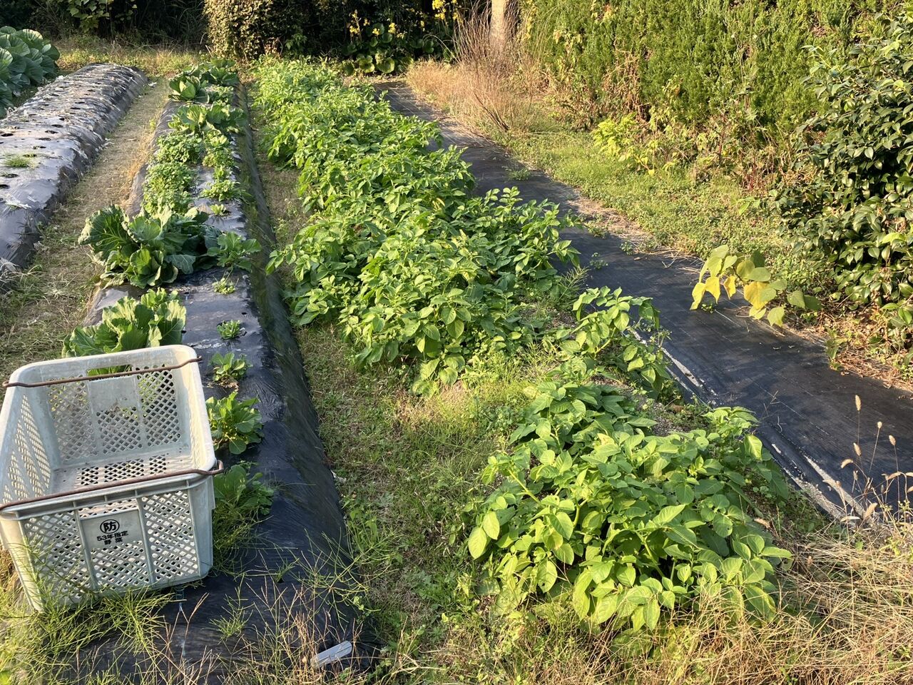 昨日の収穫前のジャガイモ畝です。まだ葉は枯れだしていませんが、これからダイコンとハクサイの出荷が忙しくなるので早めに収穫しました。