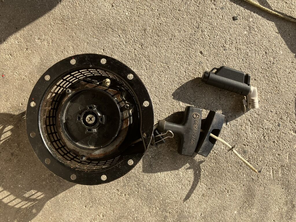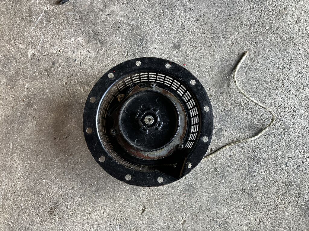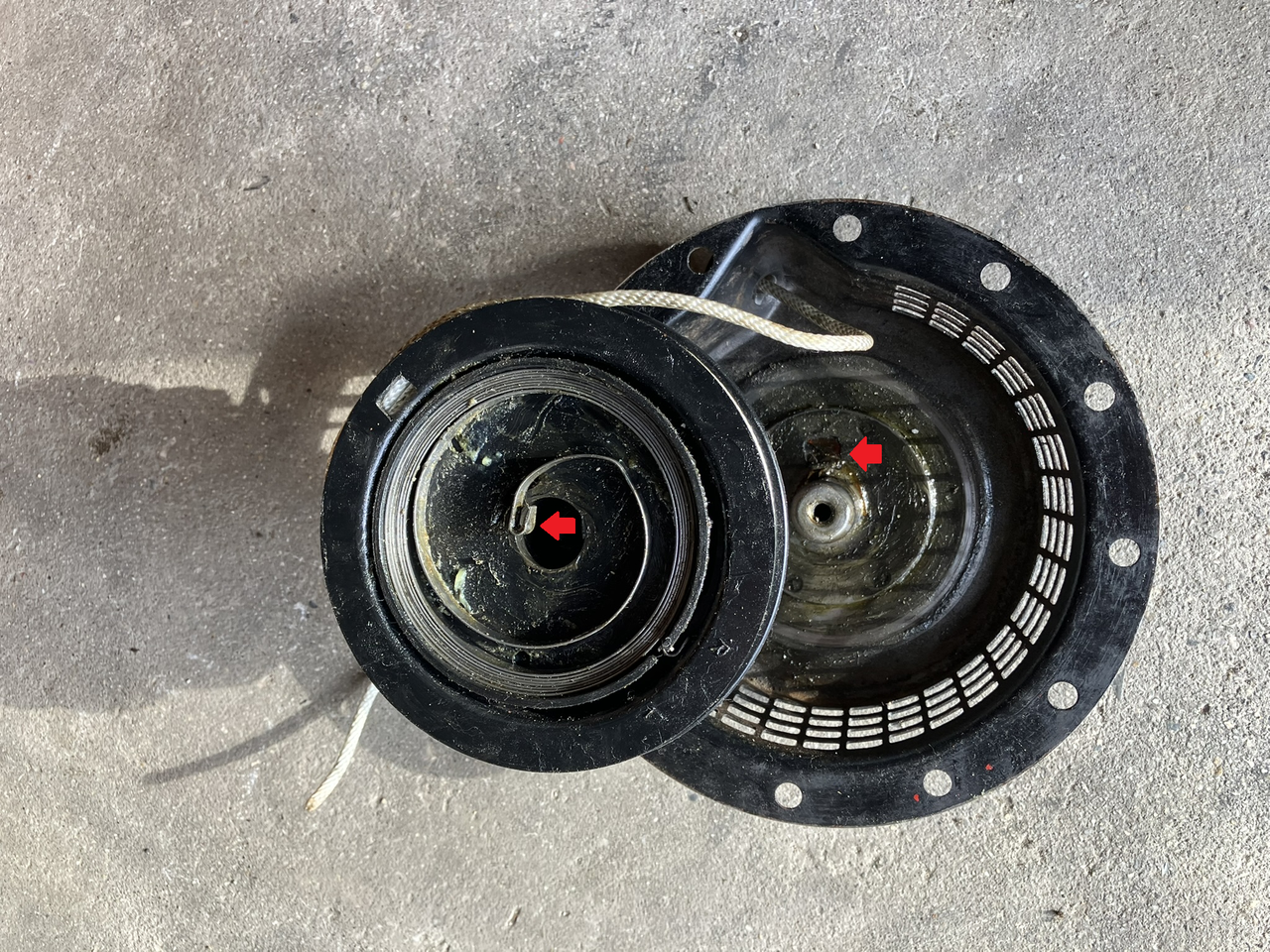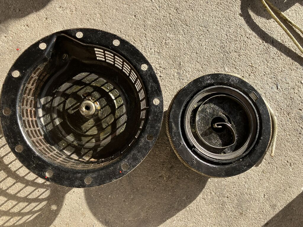 リコイルスターターを分解した状態です。バネが飛び出さない様に外せば良かったのですが、バネが外れてしましました。