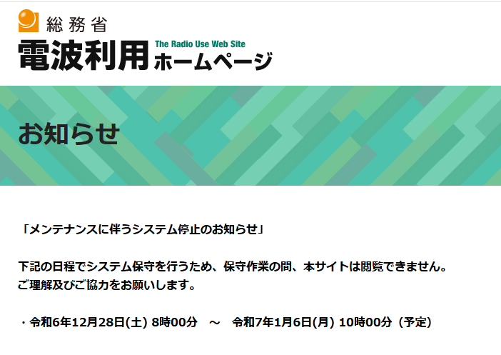 総務省 電波利用 ホームページ メンテナンス中 2024年12月28日 電波利用ホームページがシステムメンテナンスで停止中です。令和7年1月6日(月)から、『電波利用 電子申請・届出システムLite』が新システムにリニューアルされる予定なので、その為でしょうかね。HAMLOGで免許状Get'sを使っているとエラーになります。1月6日までは免許状Get'sをオフにしておきます。 < 前の記事次の記事 > コメント コメント一覧 (2) 1. JA4MNO 2024年12月28日 15:54 交信ありがとうございました。 メンテナンス期間はこの表示が面倒ですが、我慢しています。 止め方を忘れちゃったもので・・・・・。 0 JA4JOE がしました 2. JA4JOE 尾中 2024年12月29日 10:03 >>1 JA4MNOさん HAMLOGで、オプション→免許状Get's の上にカーソルを置いて、シフト+左クリックで解除されチェックマークが消えます。再度常時起動するのも、同じようにシフト+左クリックです。 0 JA4JOE がしました (お願い)質問はメールではなく、コメントでお願いします。「名前」欄にお名前をお願いします。アマチュア無線関係の質問はコールサインをお願いします。 コメントフォーム 名前 コメント 記事の評価 リセット リセット 顔 星 情報を記憶 コメントを投稿する