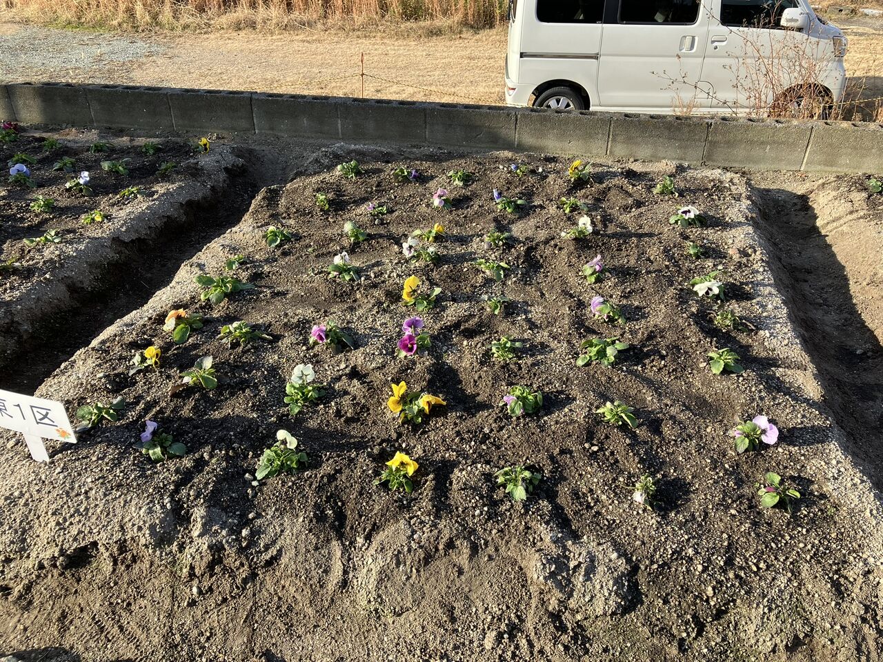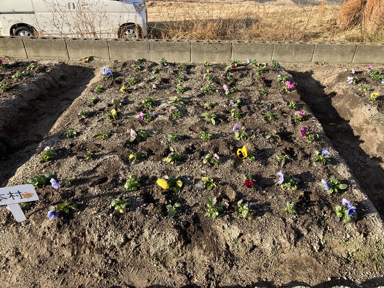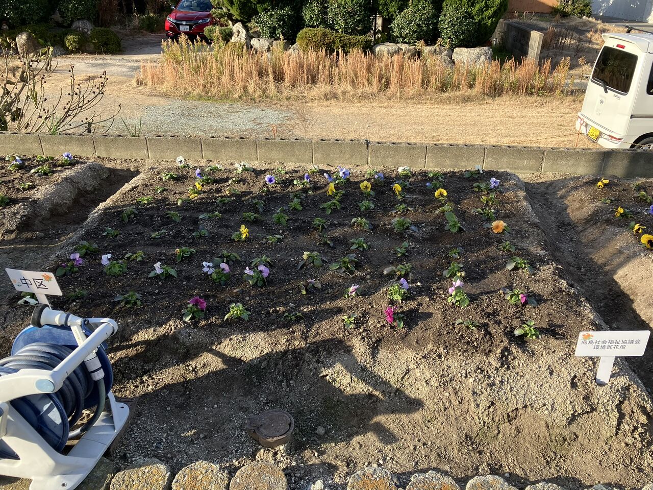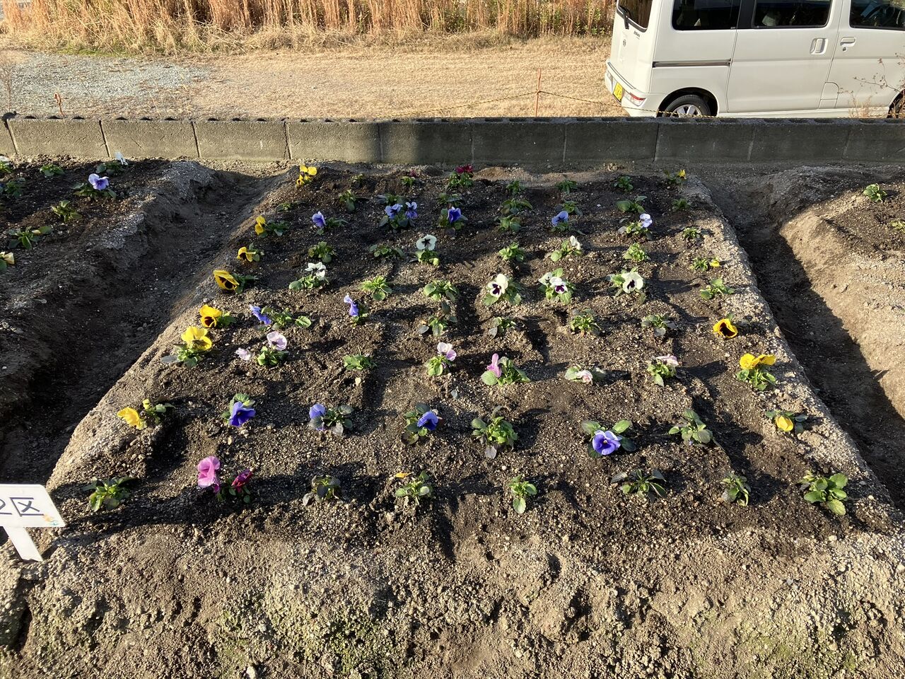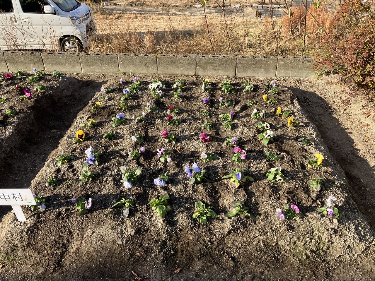 作業後の花壇の様子です。植付けから1か月経って花が増えました。ただ、植付けが遅かったので昨年の同時期と比べるとあまり株が大きくなっていません。