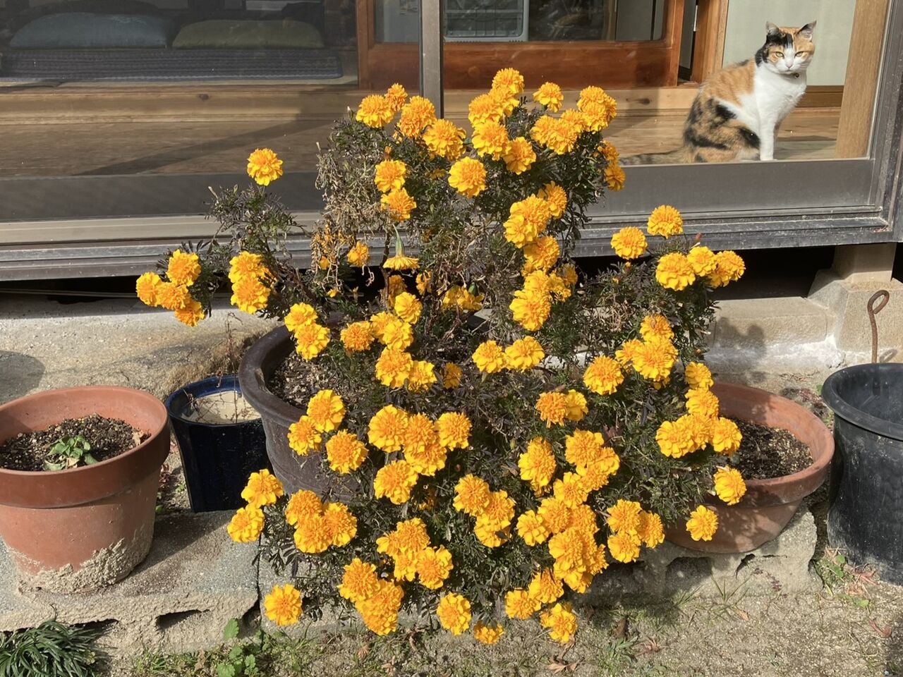 鉢植えの黄色マリーゴールドは夏の間は葉ばかり茂っていましたが、秋になって花がたくさん咲きました。