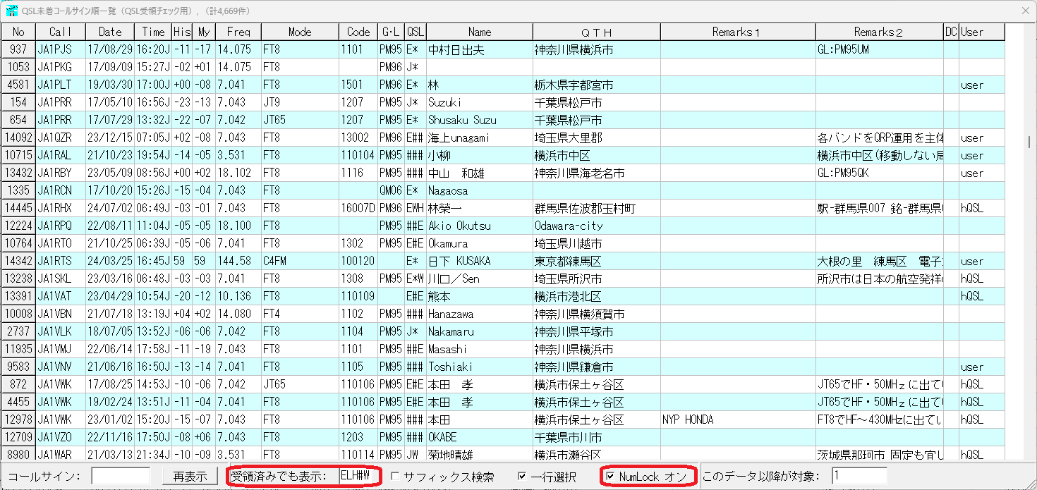 受領済みでも表示:はQSL欄3文字目に紙QSL未受領でも入力している可能性のある文字を羅列しています。