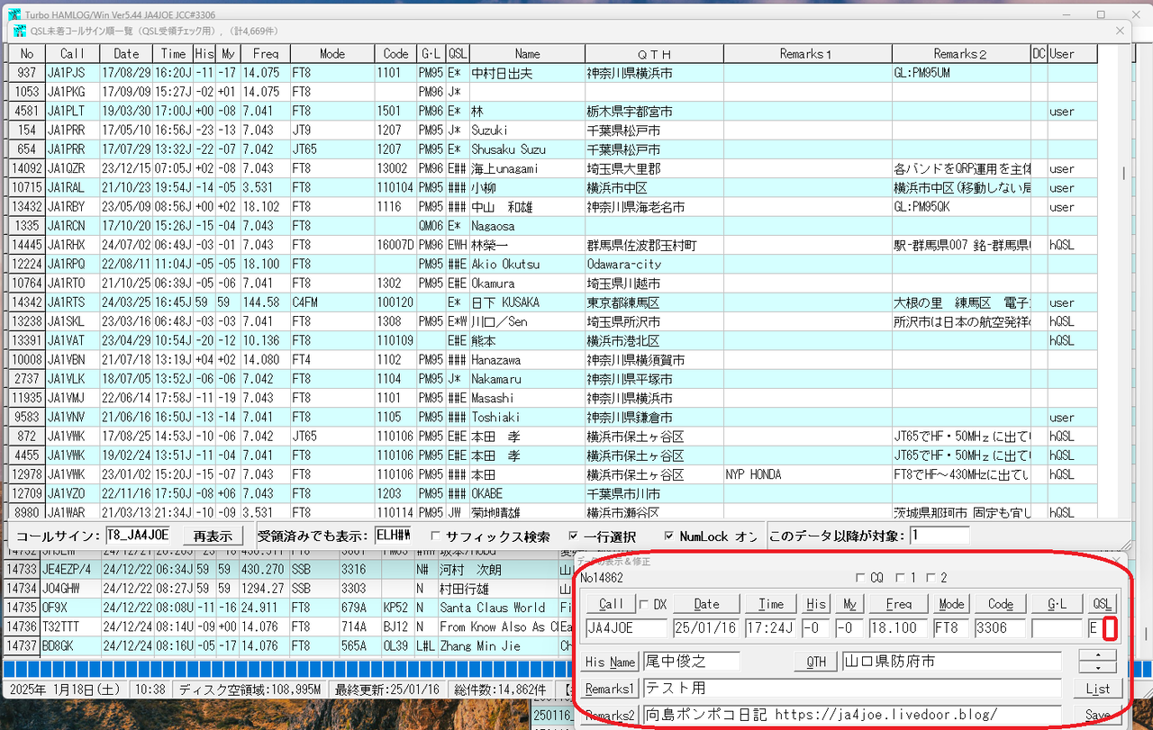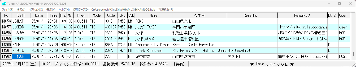 このため、HAMLOGにテスト用のJA4JOEとの交信データを入れてテストしてみました。