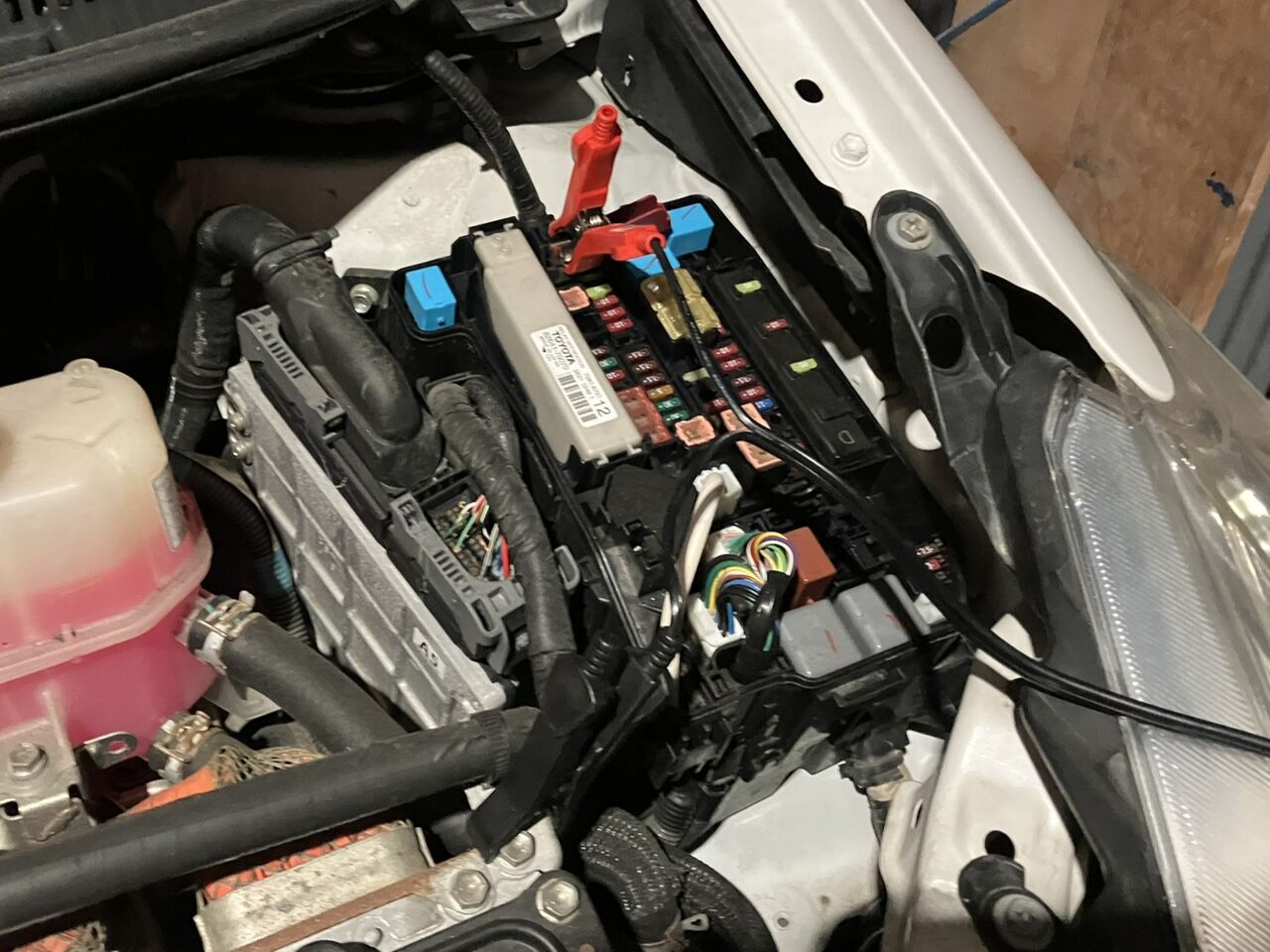 ブースターケーブルを持ってないので、とりあえずヒューズボックスの救援用端子に充電器をつないで充電しておきました。