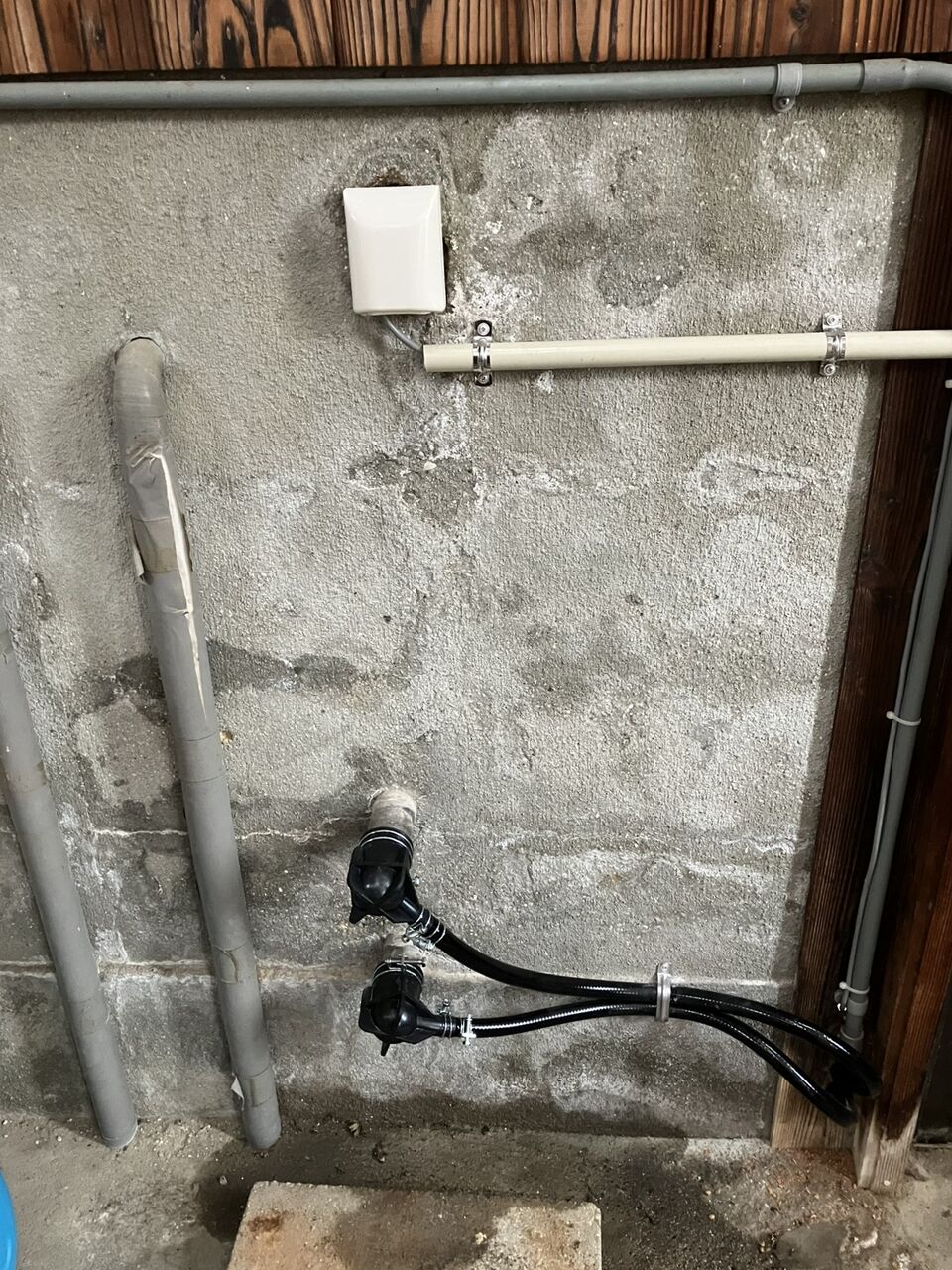 ガス風呂釜から黒いフレキシブルパイプ2本が、土間のボイラーが付いていた浴槽のパイプに接続されています。