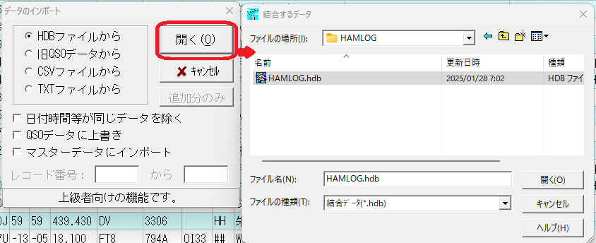 [開く] からUSBメモリーのHAMLOG.hdbを開きます。