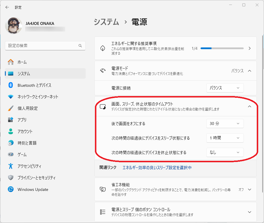 (補足2)画面、スリープ 、休止状態のタイムアウト