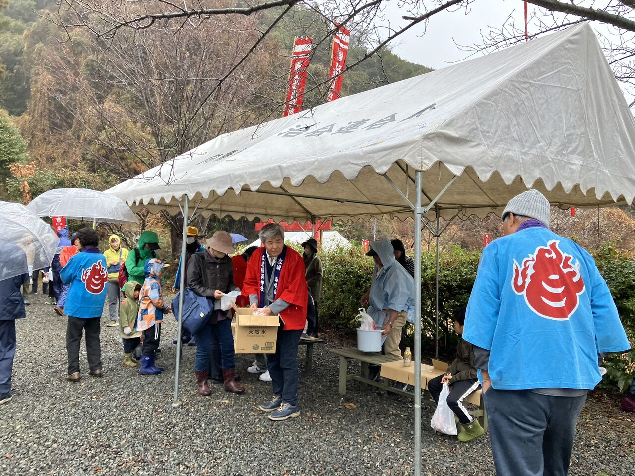 餅まきが始まる11時半前から雨が強くなってきて、餅を撒くのはやめて手渡しで渡す事になりました。