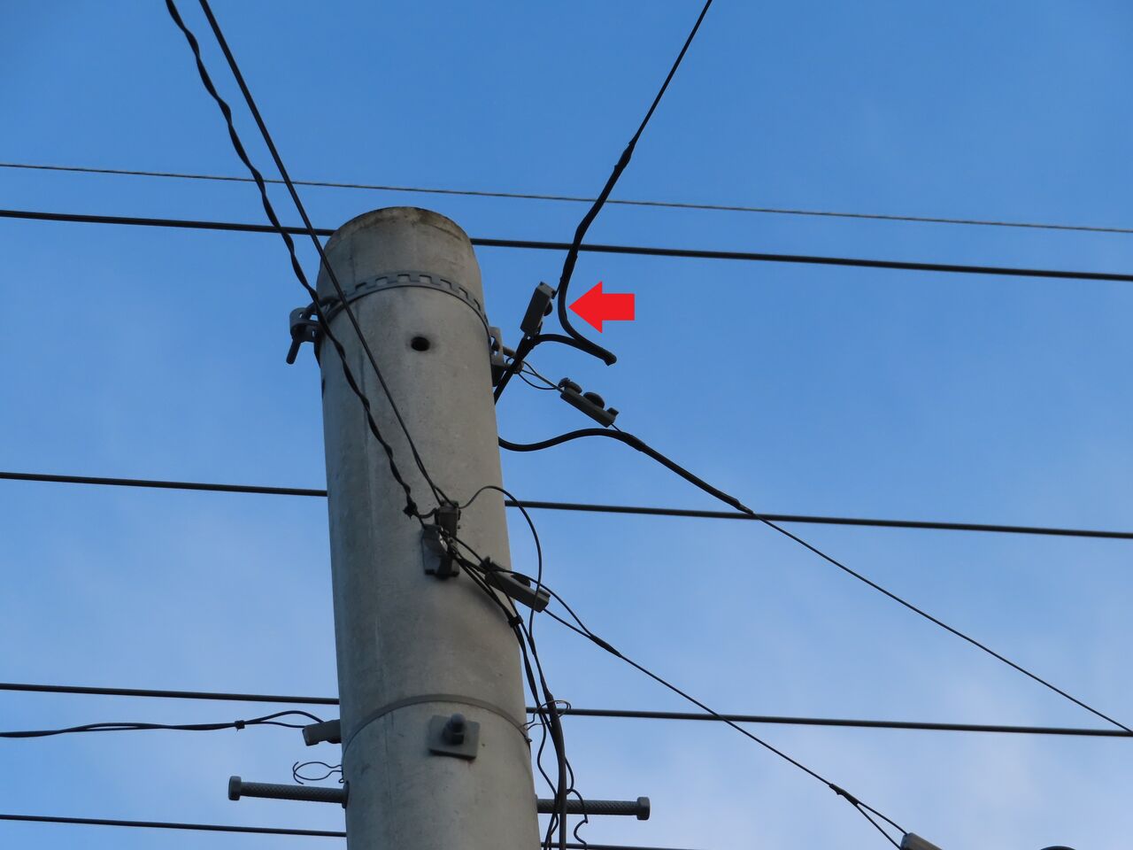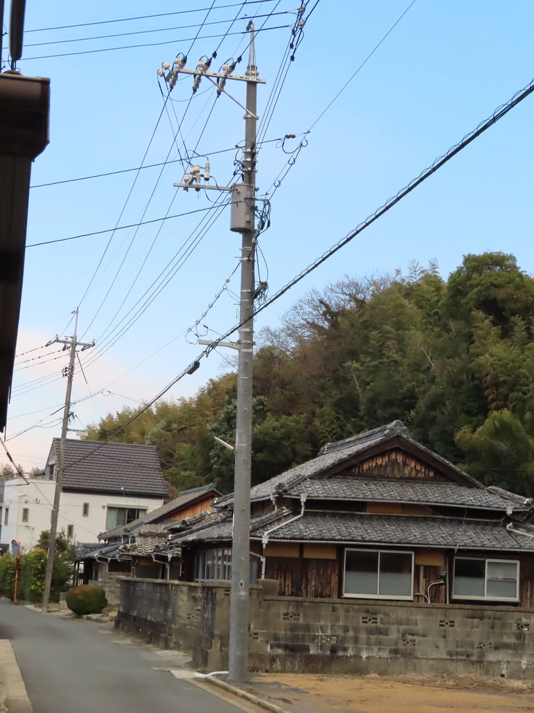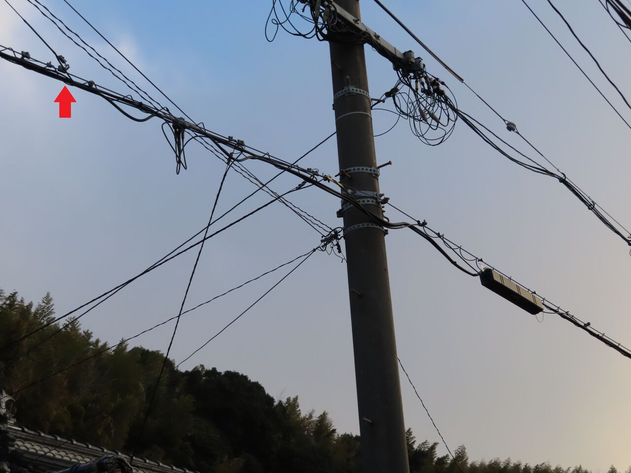 この電柱のすぐ西側に光クロージャ―がありますが、我が家へ引き込まれた光ケーブルは東側20mくらいのところにある電柱側の光クロージャ―からだそうです。