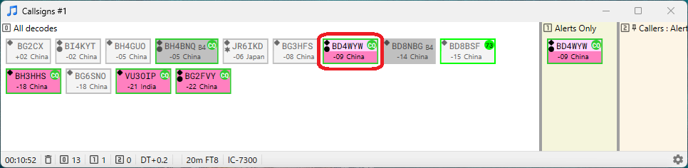 試しにBD4WYN局をWnted CAllsings#1に入れて表示してみました。Wnted Callsings#1 Alertの薄ピンクのBOXにCQ Alertの濃いピンクの国名が表示されました。