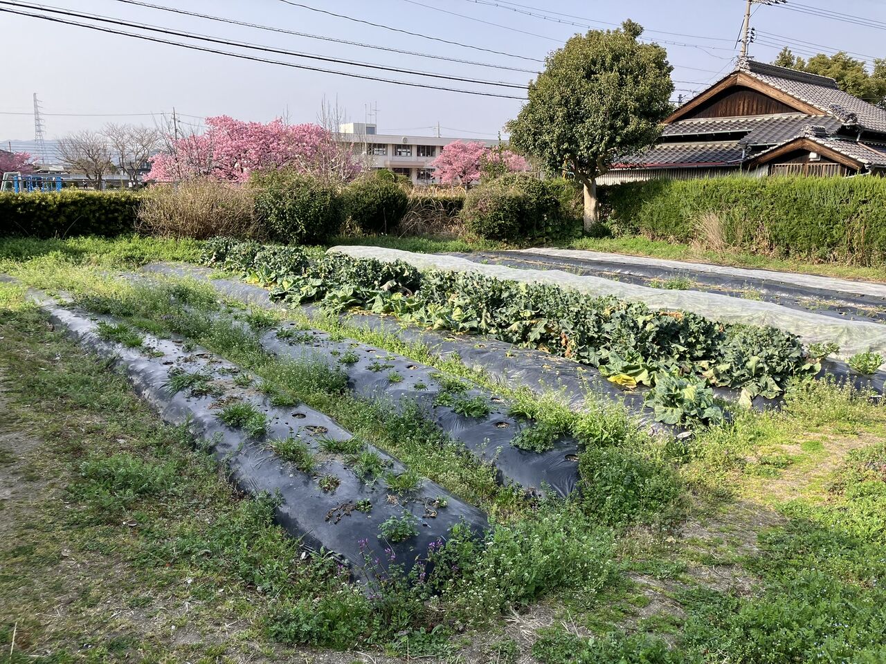 ヒヨドリ除けの不織布は初夏採りキャベツだけ残して片付けました。後ろに満開の蓬莱桜が写っています。ピンクがきれいですね。(^^;