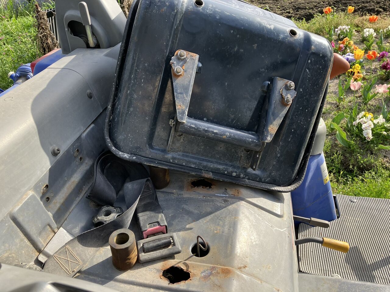 4月18日にトラクターで西側畑を耕しましたが、作業中にトラクター(イセキ THS-20)の座席(シート)がグラグラしだしました。確認すると座席を本体に固定しているネジの周辺部分の板金が千切れてネジが取れていました。