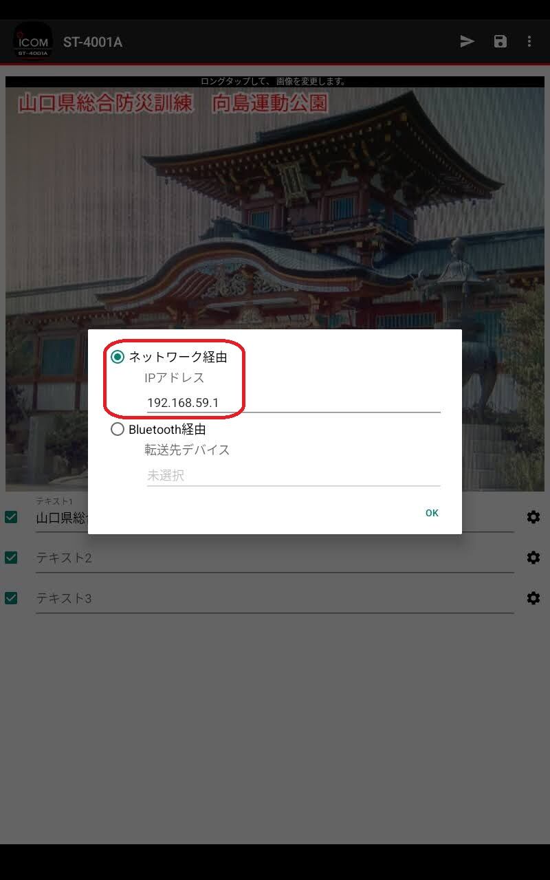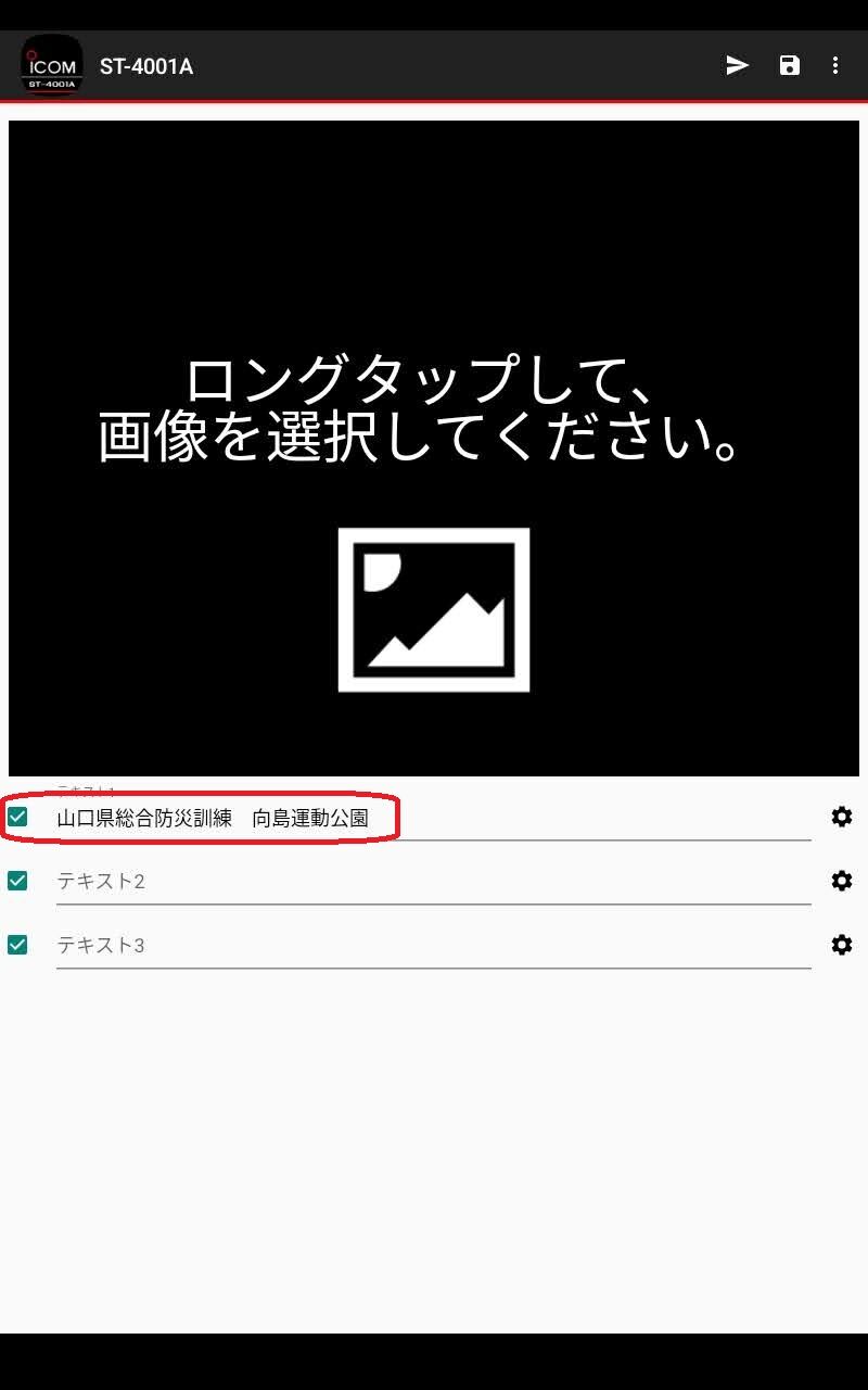 なお、画像に表示するテキストは送信画像表示画面の下の「テキスト1」から「テキスト3」に入力して表示します。「山口県総合防災訓練 向島運動公園」を設定してあります。