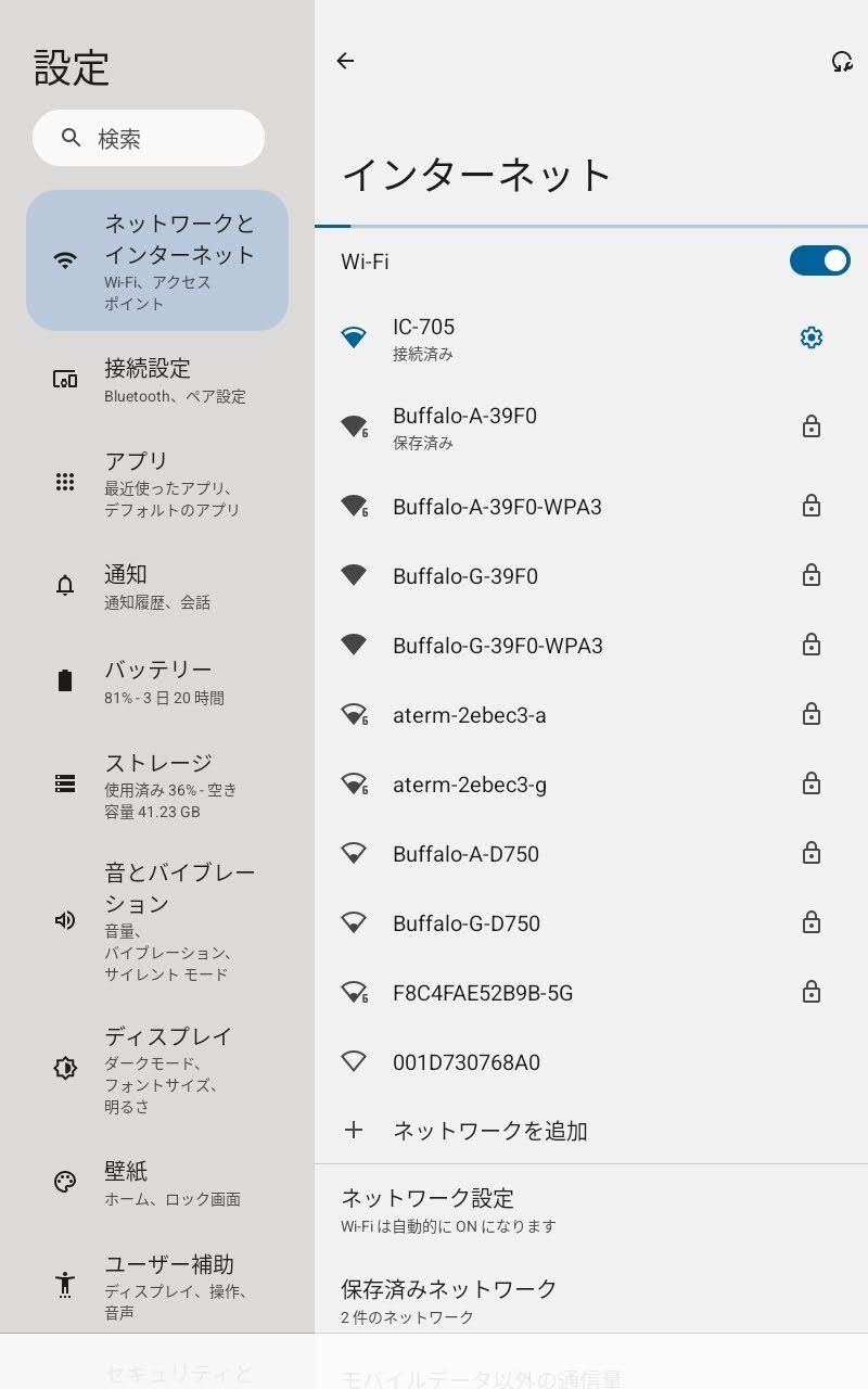 Andoroid端末の設定でWLAN(Wi-Fi)接続先をIC-705にします。