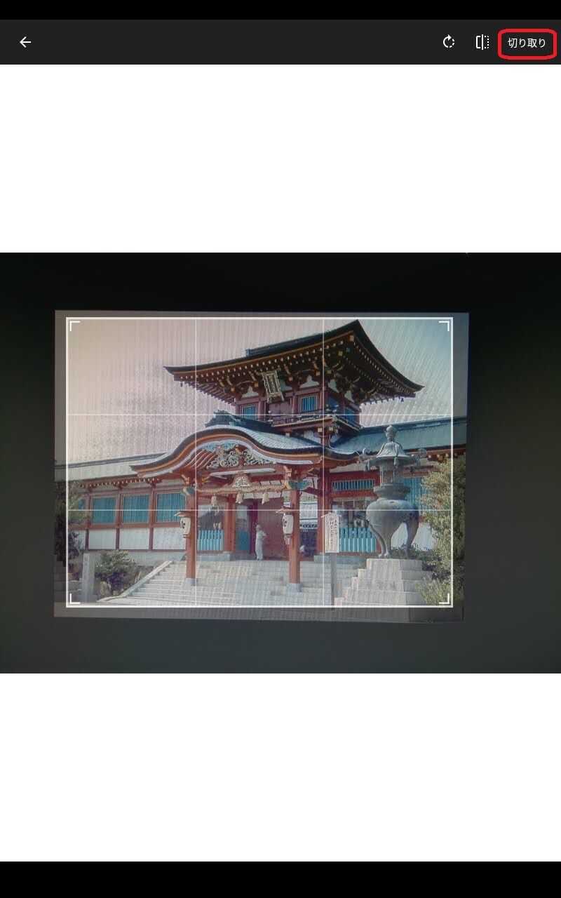 ST-4001Aに撮影した画像が表示されるので、トリミングエリアを指定して、右上の[切り取り]をタップします。