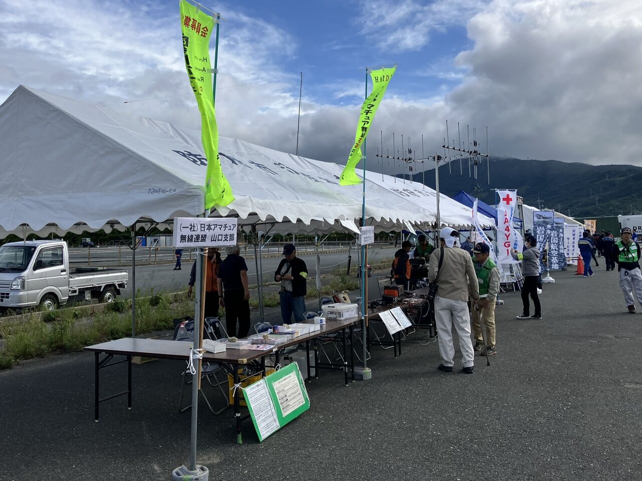 JARL山口県支部(展示のみ)、防府市アマチュア無線災害ボランティア(HARDV)、 山口県赤十字アマチュア無線奉仕団が共同で使用するテント2張りは既に立ててありました。
