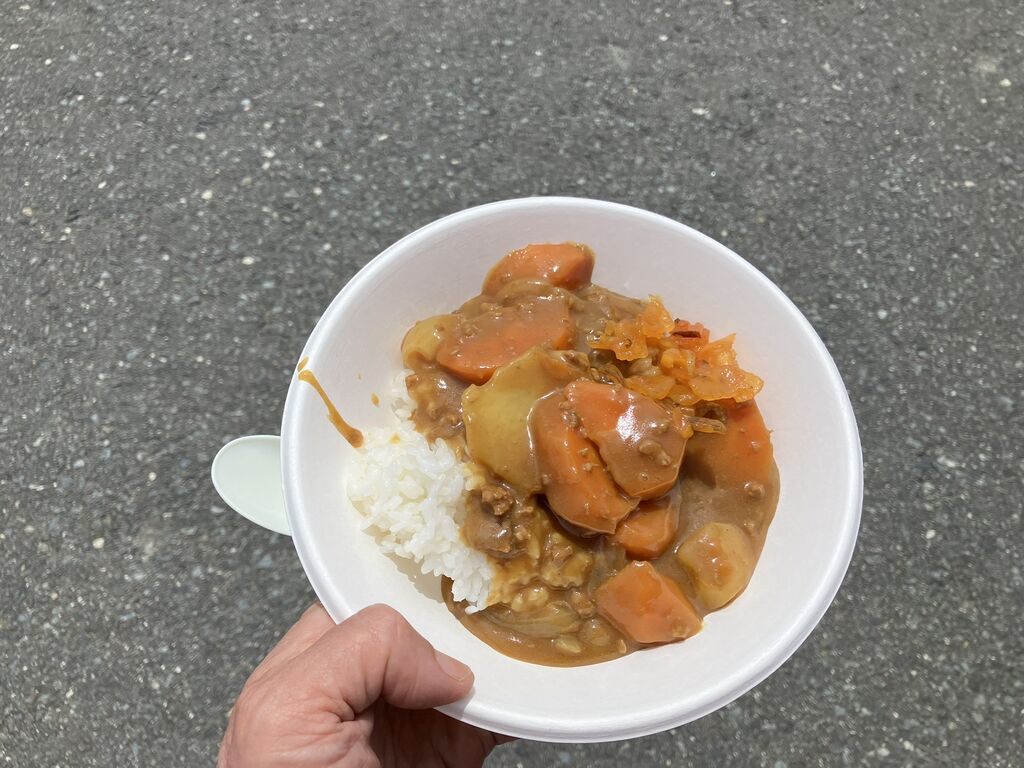 11時から炊き出しの提供が始まったので、自衛隊のカレーと一般社団法人 レベルフリーさんの牛丼をいただきました。