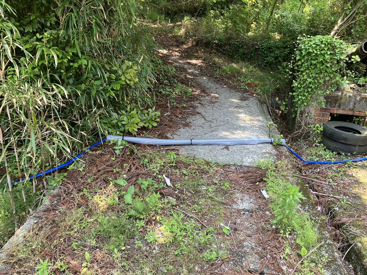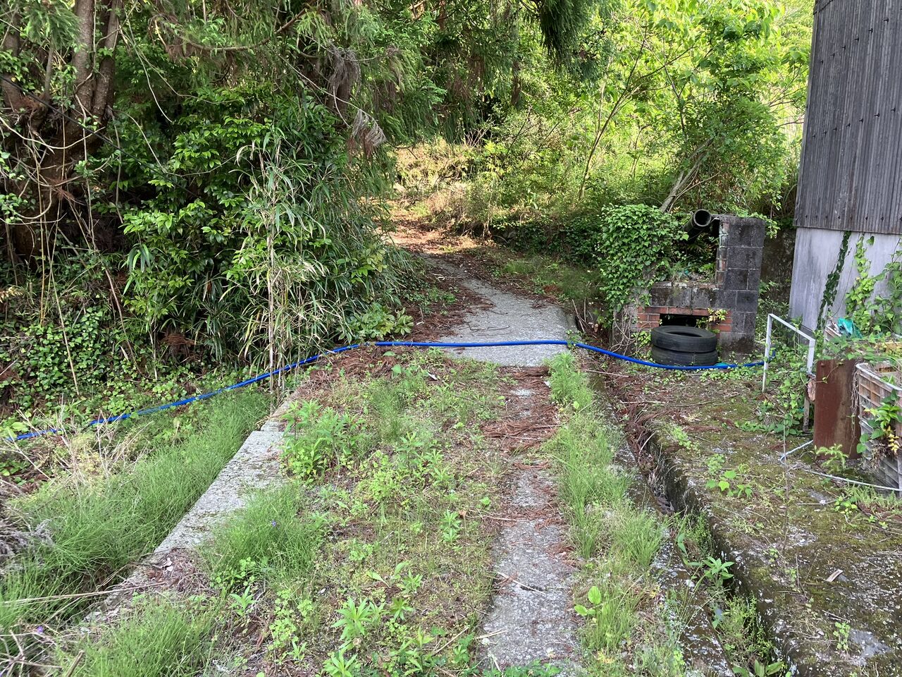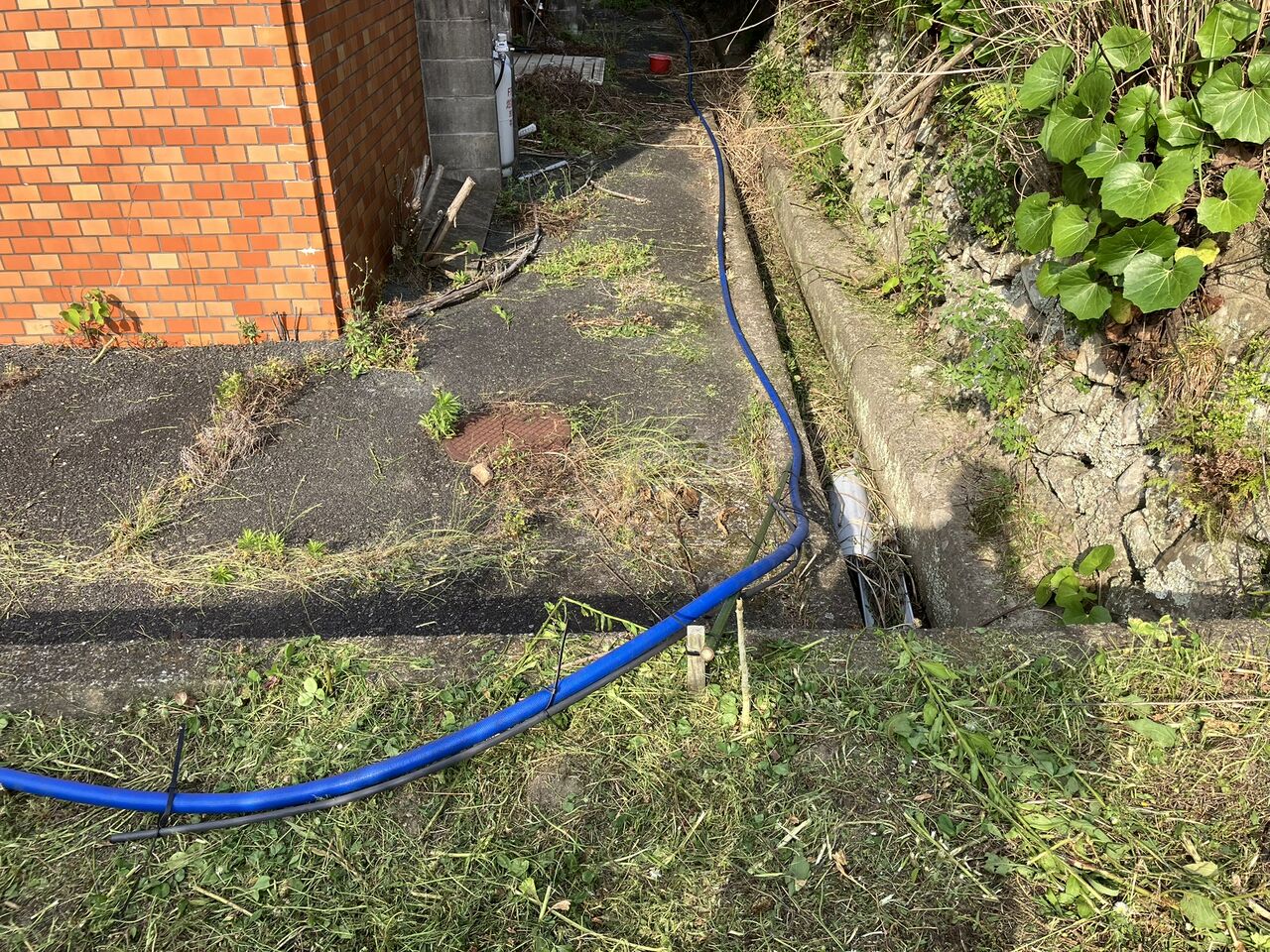 ホースは隣の旧JAの建物の裏を通させてもらっています。