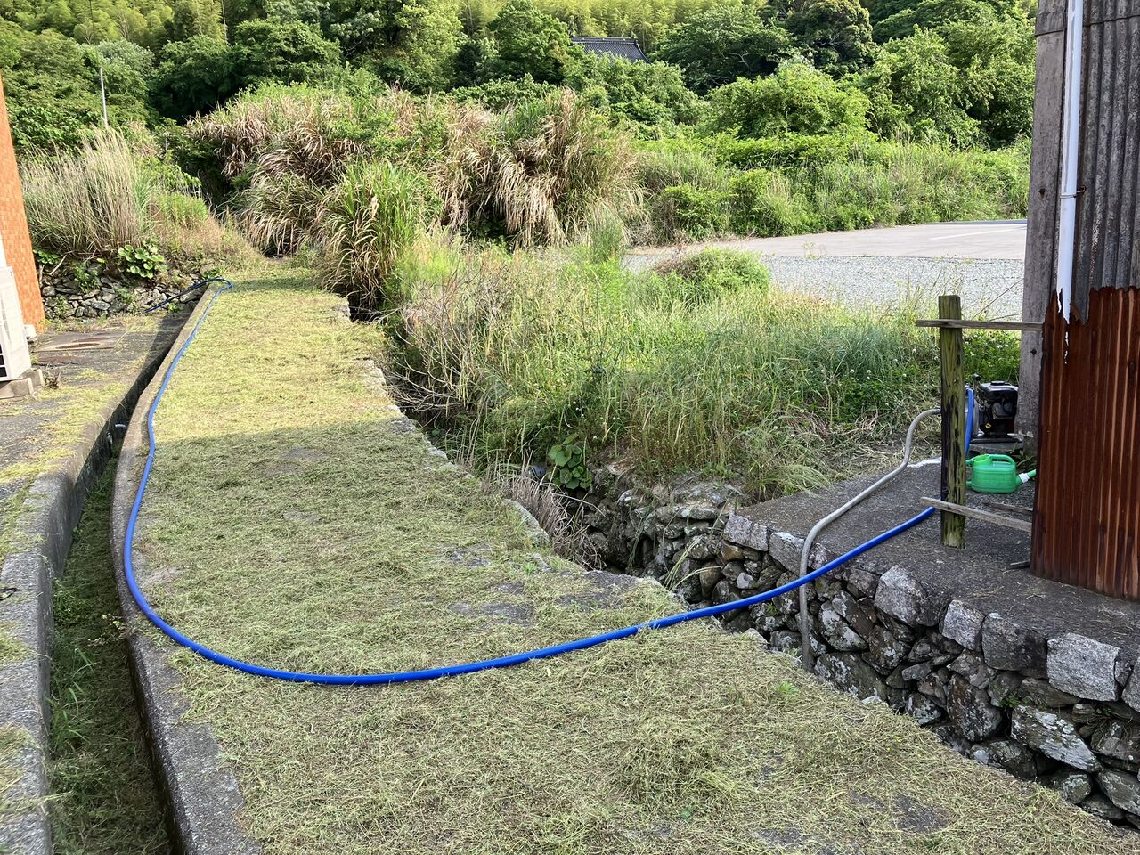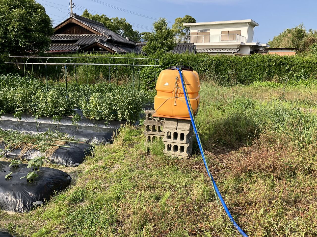 毎年、夏の水やり用に貯水タンクを設置して、100mくらい離れた農機倉庫横の小川からホースを引いて水を貯めています。